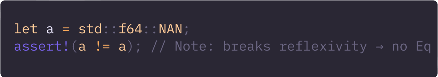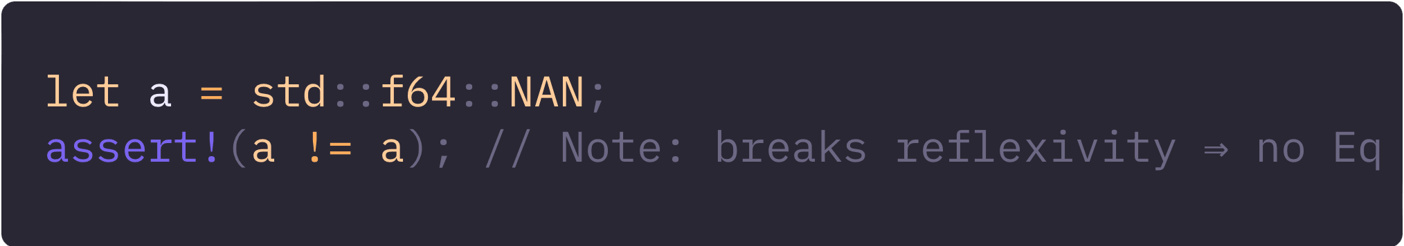 Equality: Eq must be reflexive — f64 can’t satisfy that because NaN != NaN.