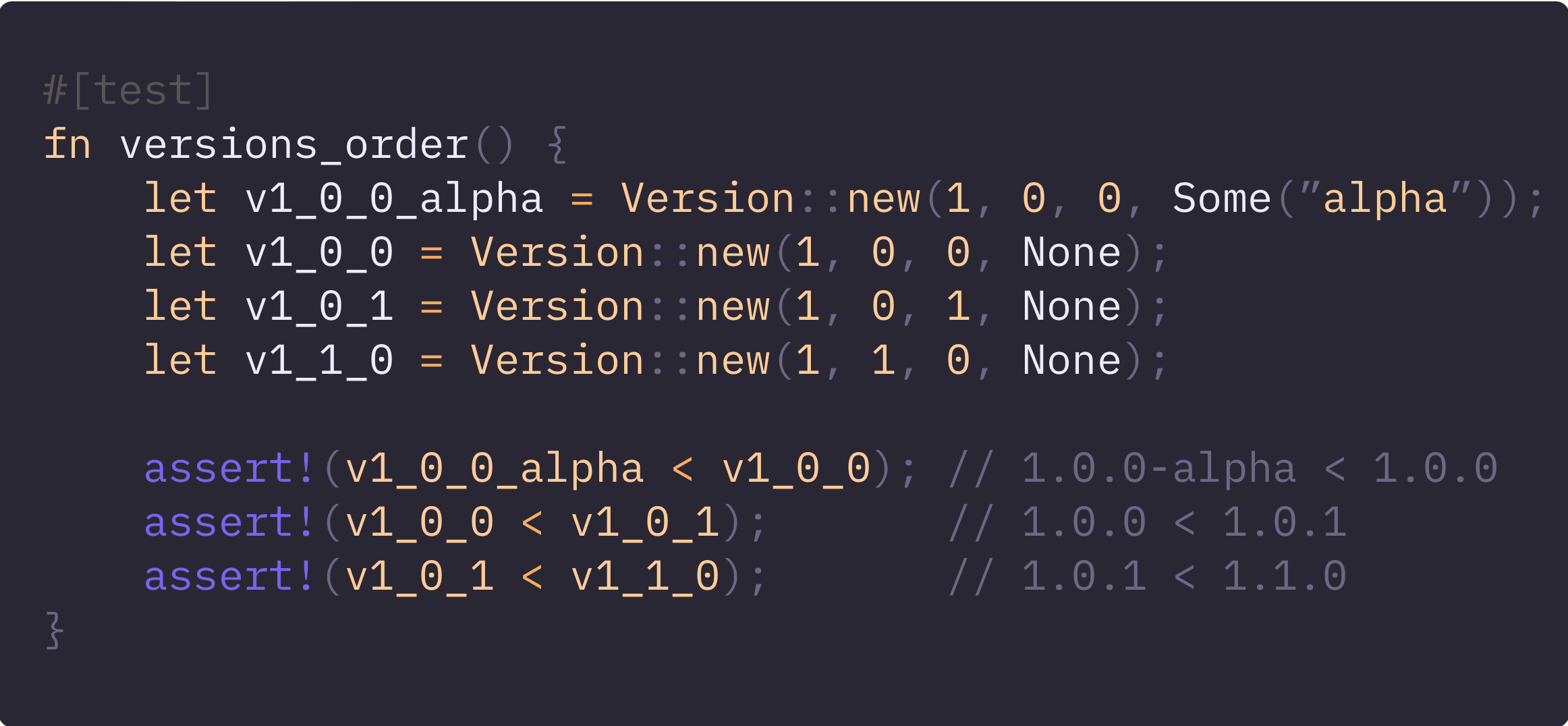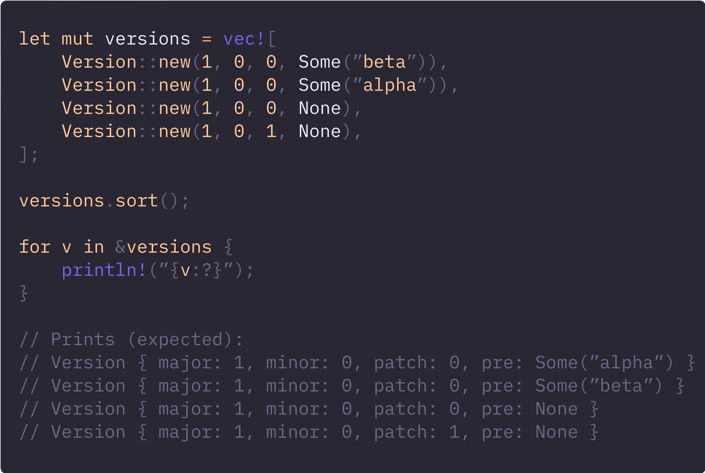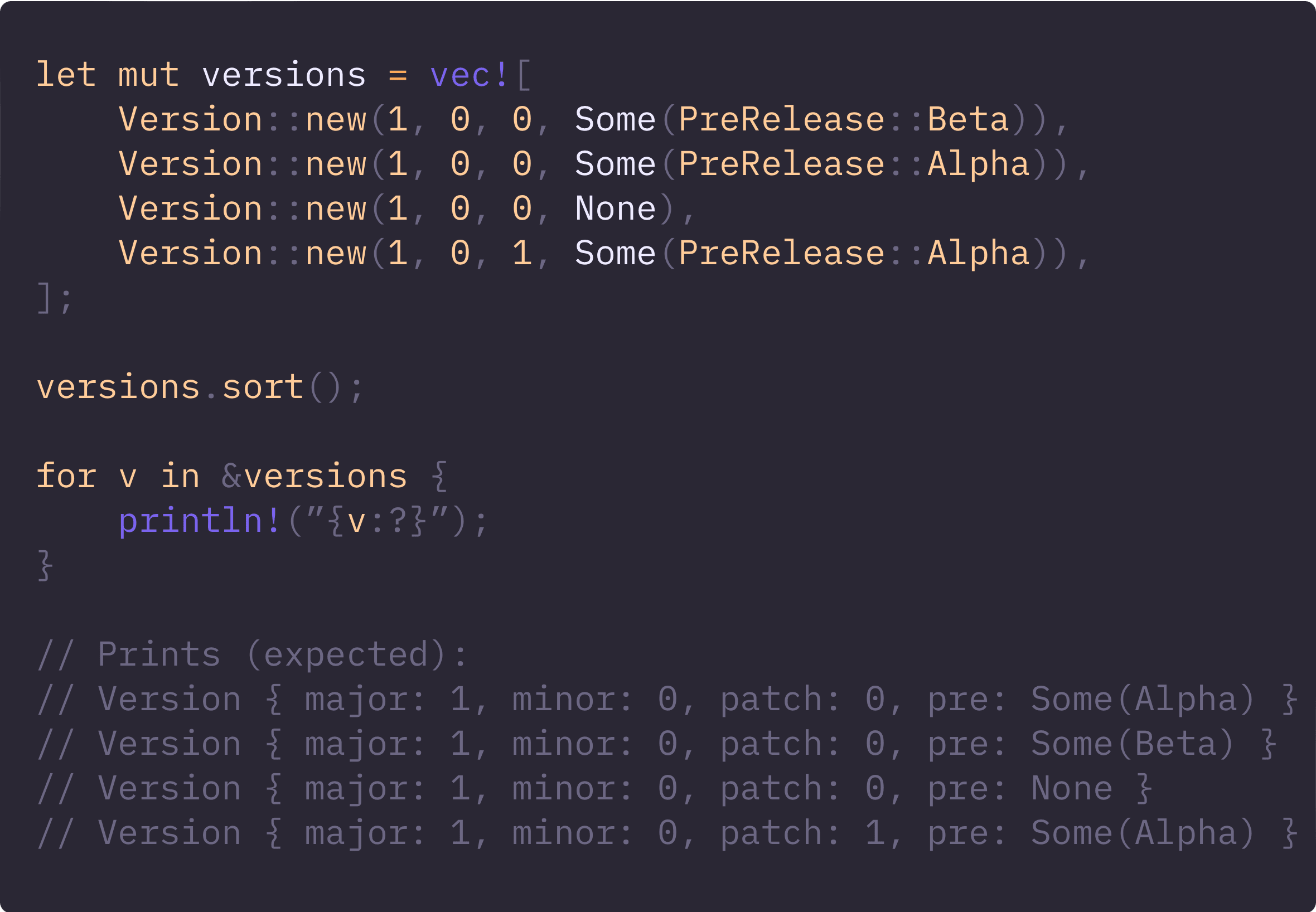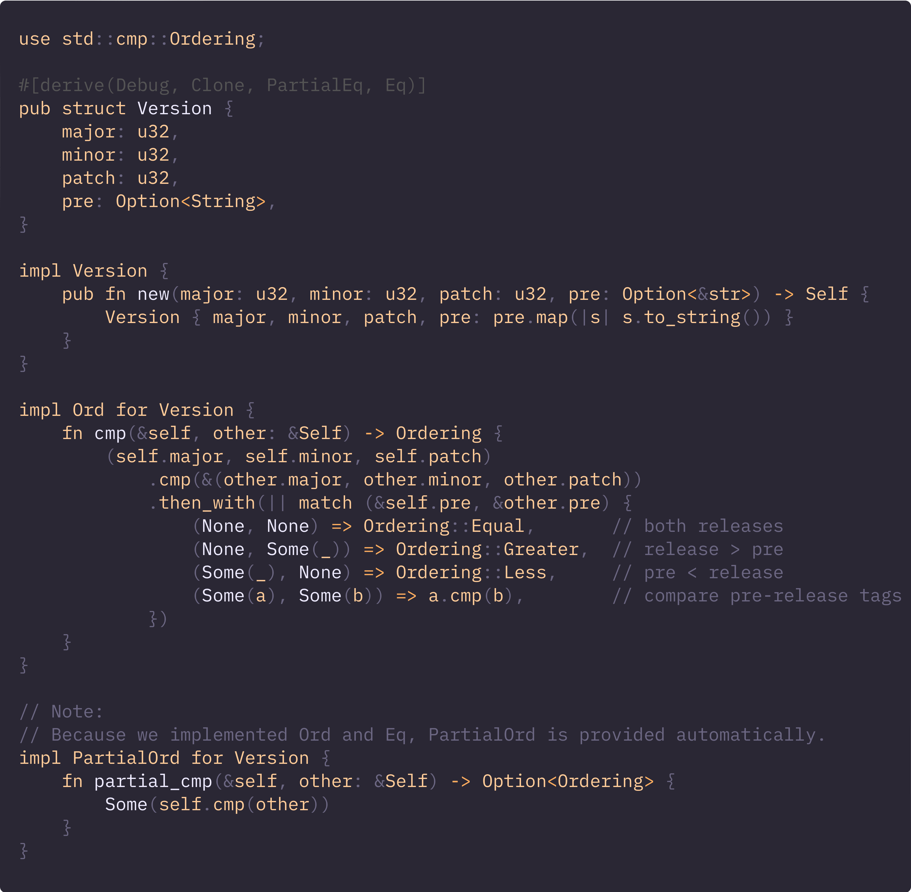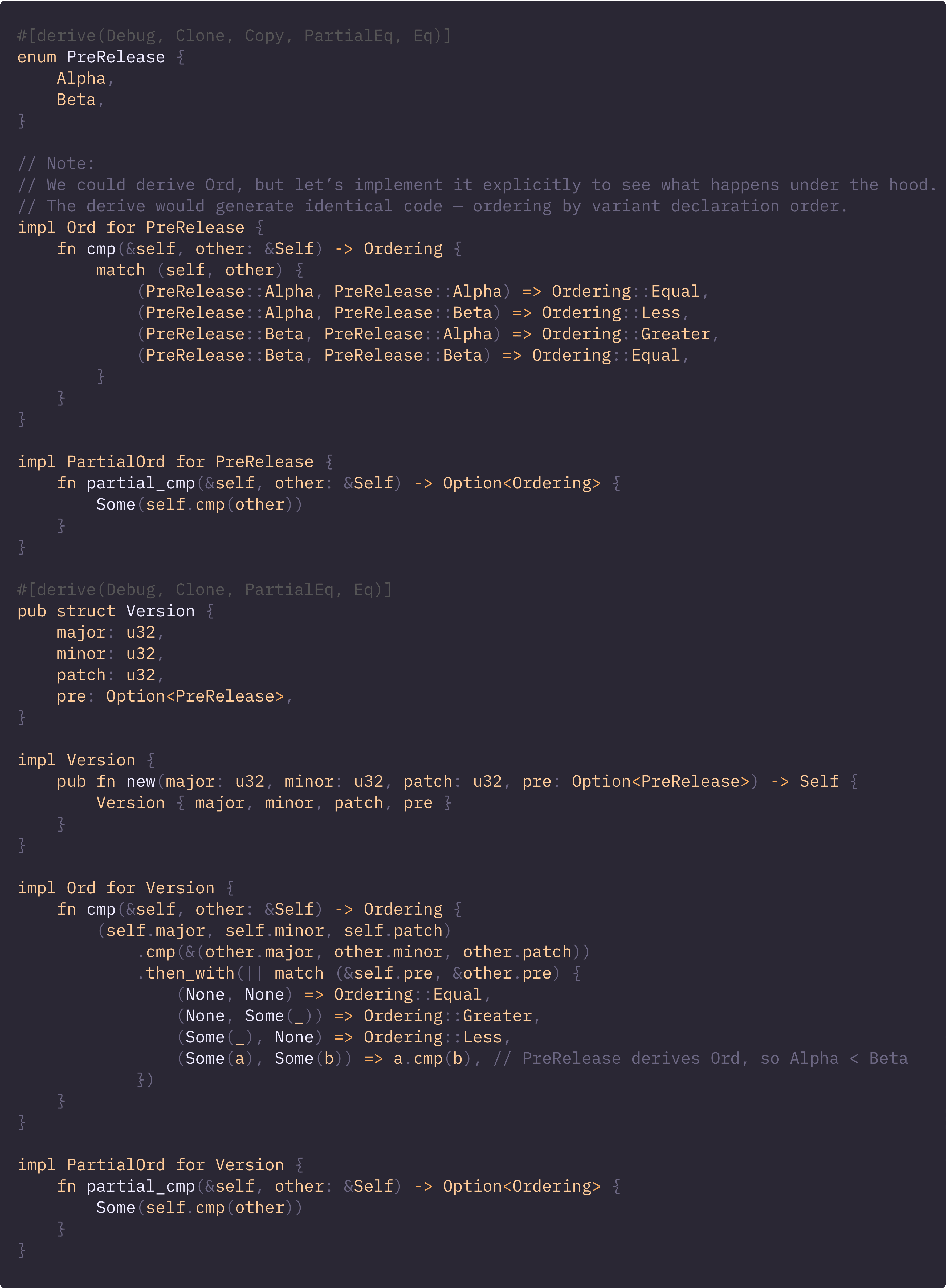 Let’s improve our Version type by replacing the String-based pre-release identifiers with a proper enum. This gives us type safety and explicit ordering.