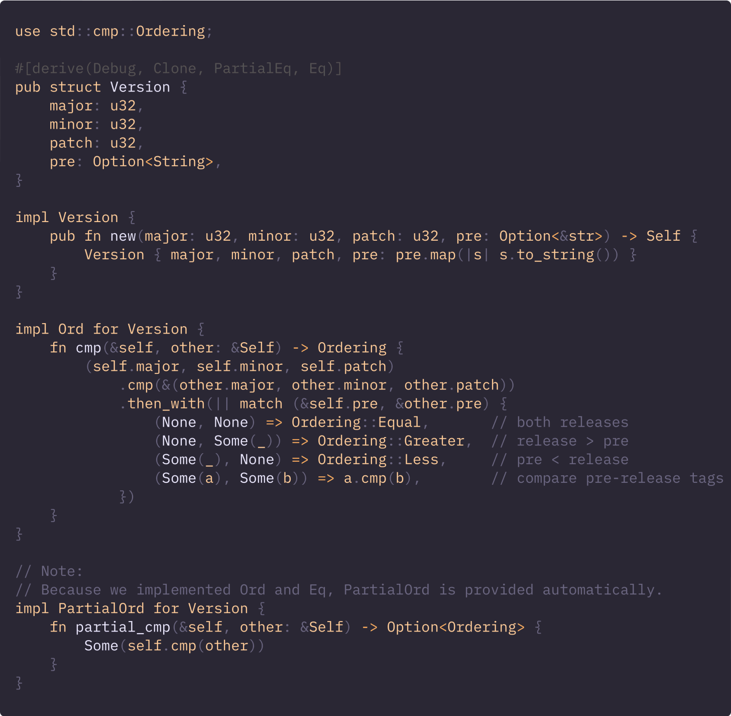 Implement traits manually when domain semantics differ from the default (e.g., Release > Pre-Release).