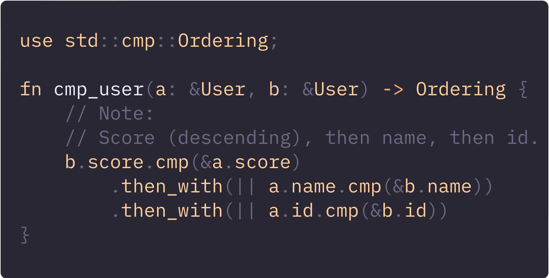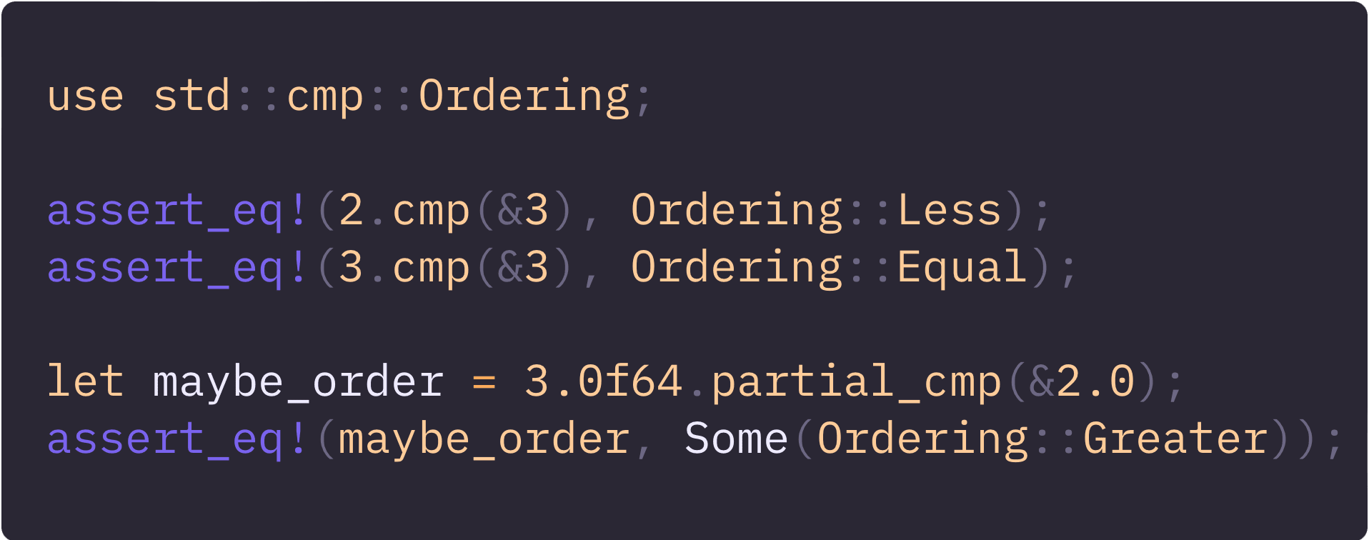 Beyond the theory, comparisons show up constantly in everyday Rust through operators, explicit comparators, and trait bounds on collections.