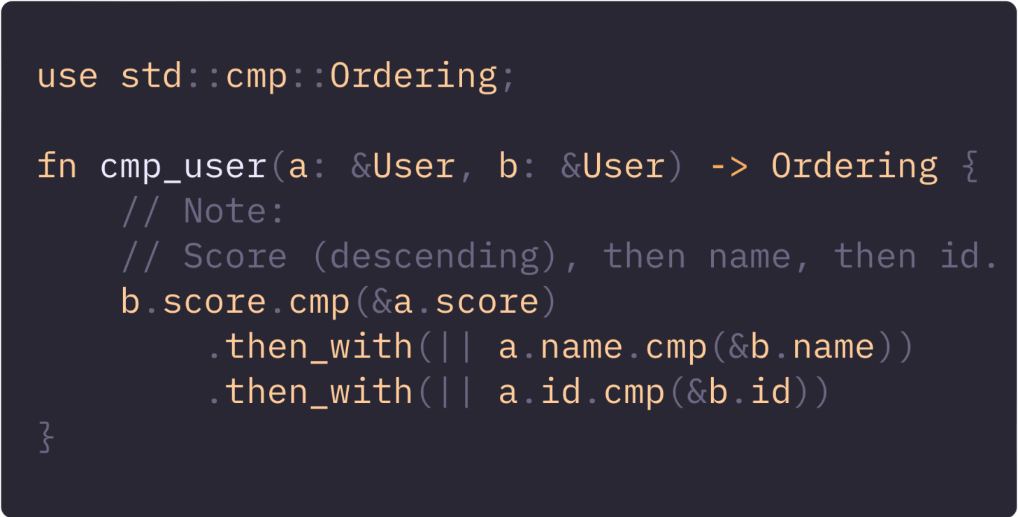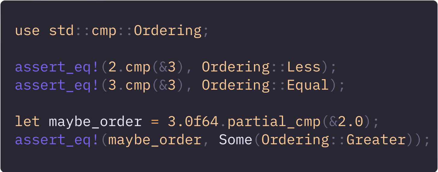 This section surveys the idiomatic patterns you’ll use most: == / != and < comparisons, cmp / partial_cmp, and where Eq / Ord drive sets, maps, and sorting APIs.
