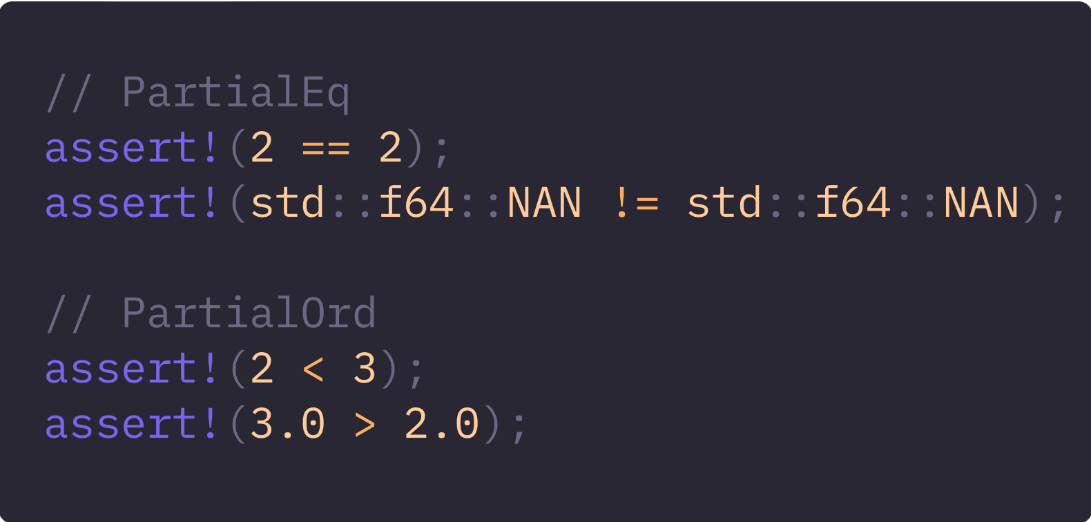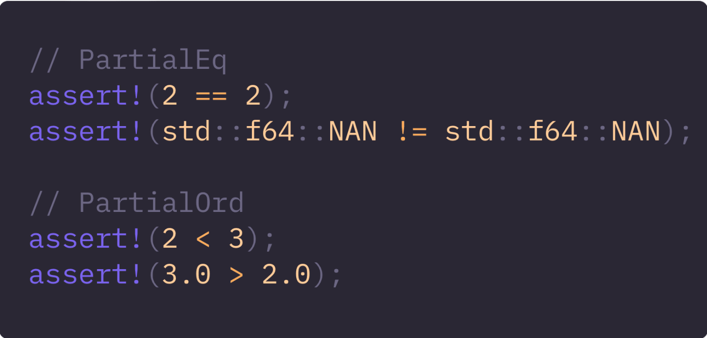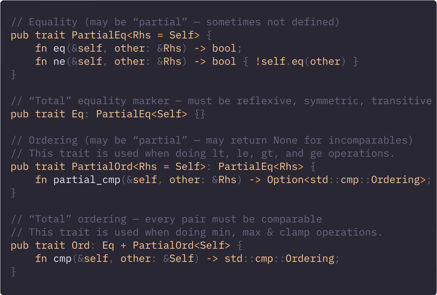 Rust distinguishes total and partial comparisons to encode mathematical laws in the type system without sacrificing practicality.