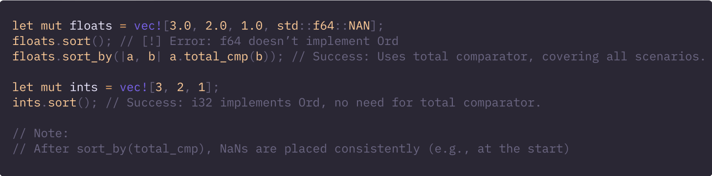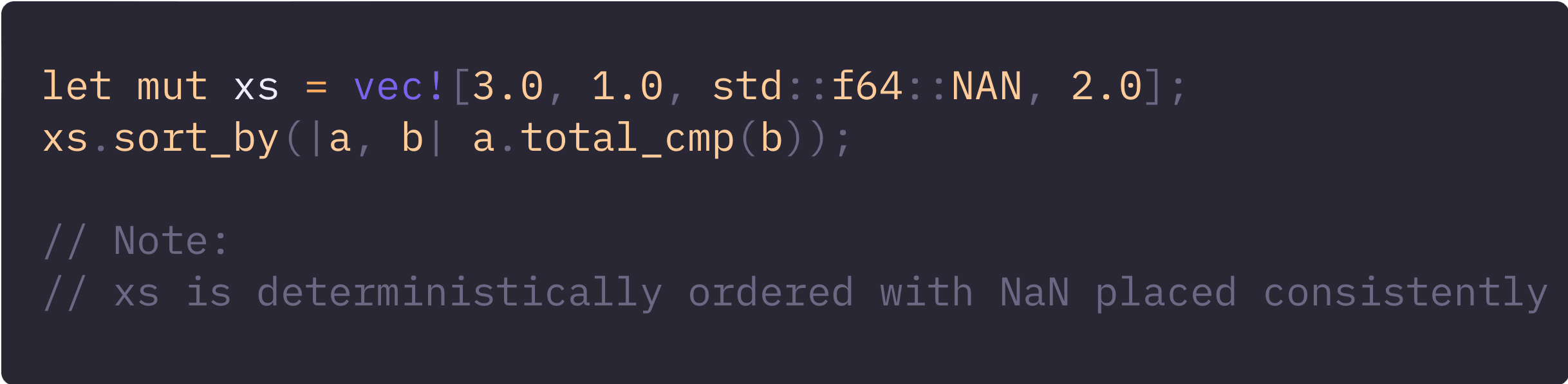Ordering: Ord must be total; NaN breaks totality, thus we need to use total_cmp for deterministic sorting.