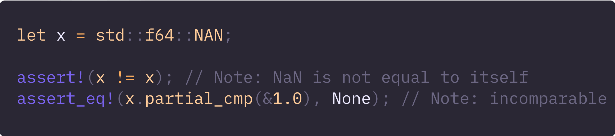 This rigor is why f64 cannot implement Eq or Ord: NaN violates reflexivity and totality.