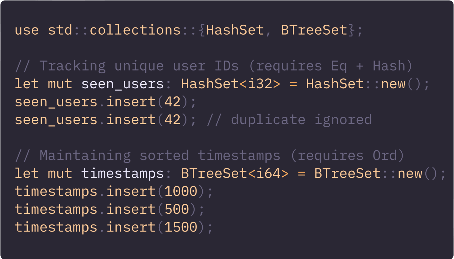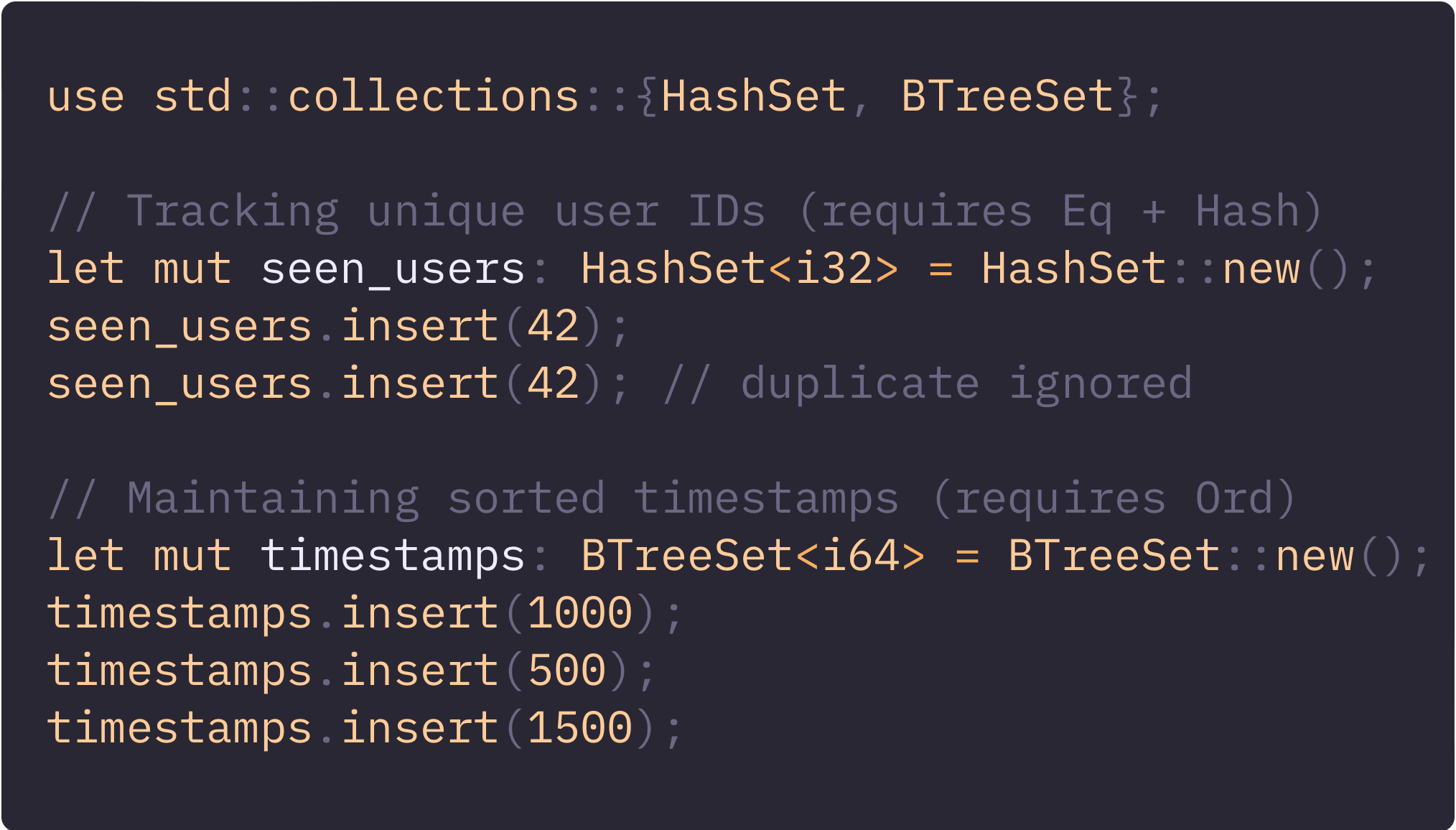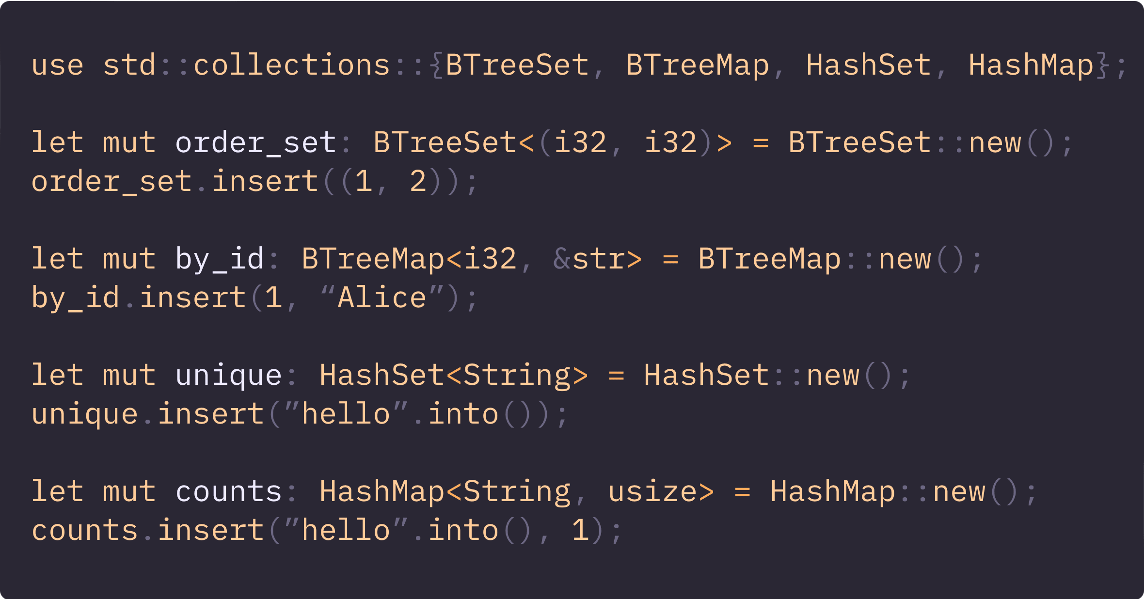 Many core collections and algorithms express their requirements via trait bounds such as Eq, Ord, and Hash.