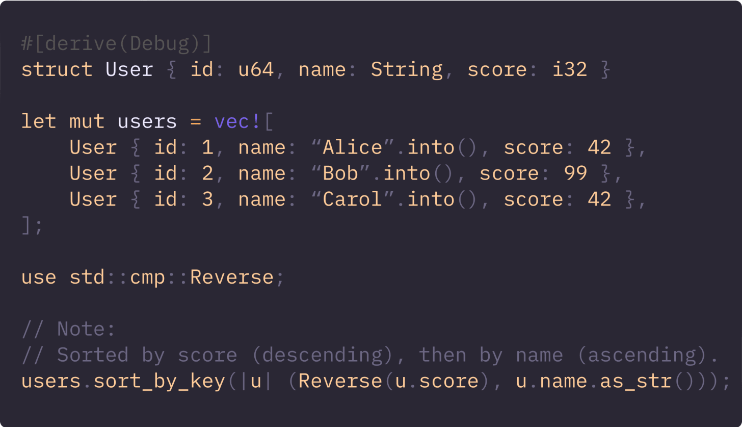 Prefer cheap & selective keys first, along with sort_by_key, Reverse, and Ordering::then_with for clear, composable comparators.