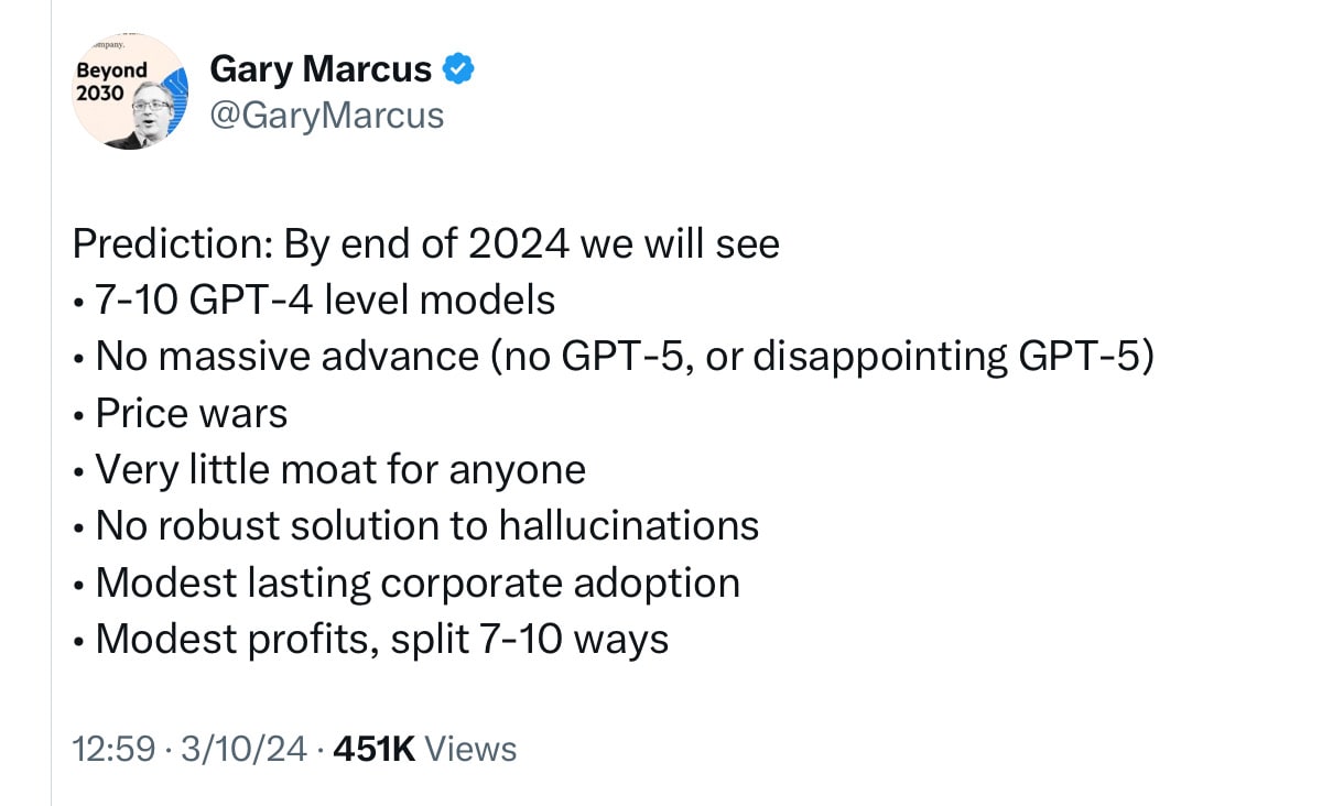 In large part, what I prophesied has come true; we now have many GPT-4 level models (more than I foresaw); GPT-5 was disappointing, and didn’t come in 2024; price wars; very little moat; no robust solution to hallucinations; a lot of corporate experimentation but not a ton of permanent inclusion in production. Modest profits was maybe a bit optimistic, with most LLM developers losing money.