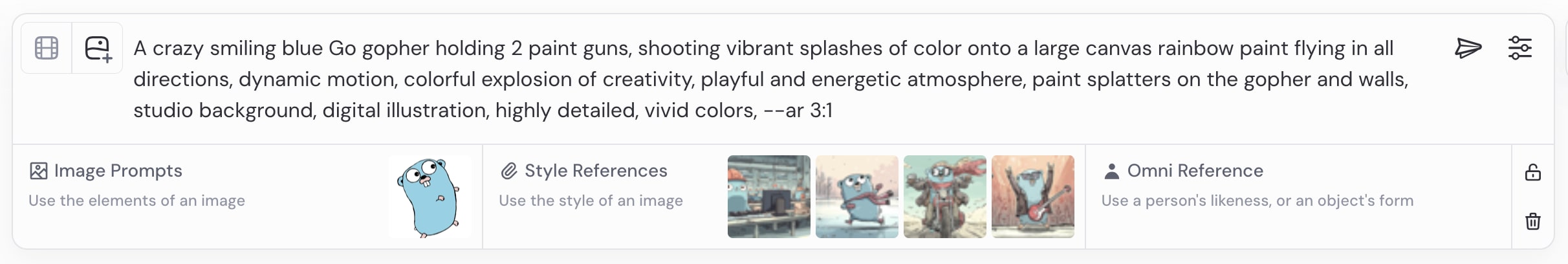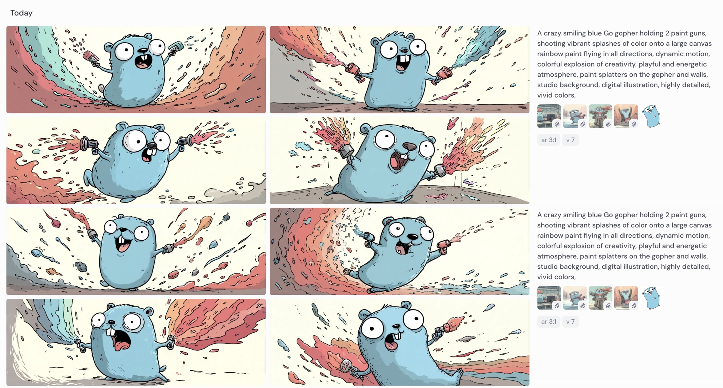 “Create prompt for midjourney: a golang gopher throwing paint with 2 guns”