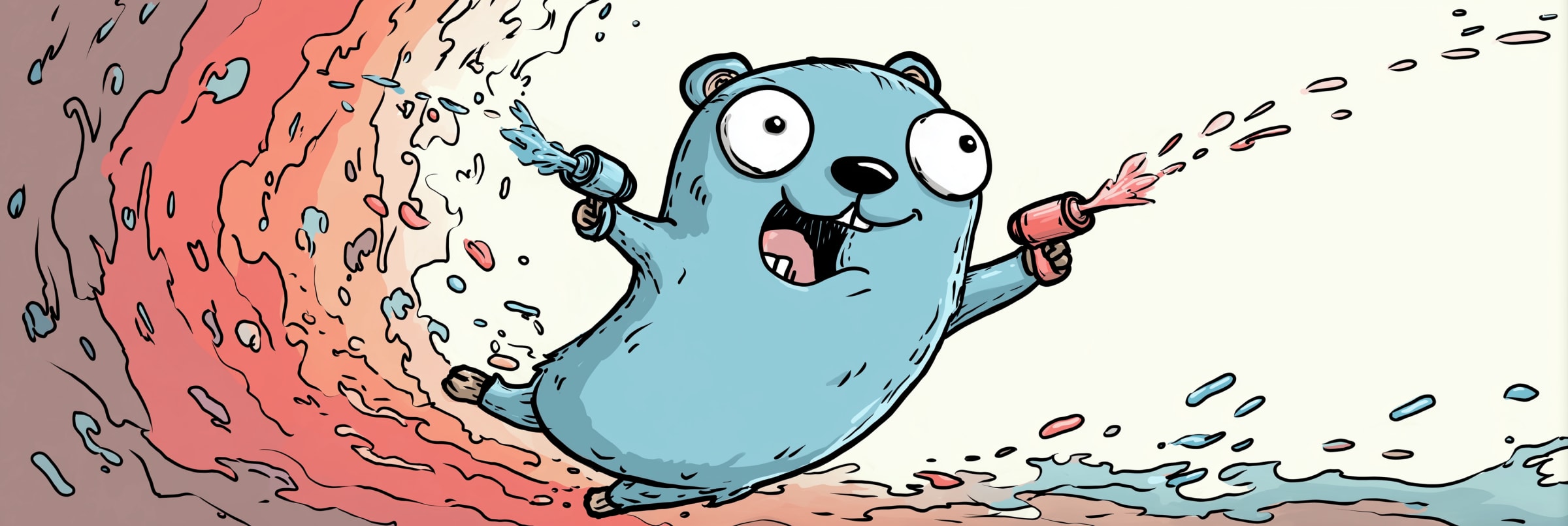 Cute Go gopher with 2 paint guns shooting rainbow colors, comic-style illustration, exaggerated expressions, bold lines, playful atmosphere, --v 6 --style cute --chaos 60