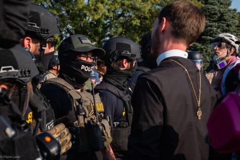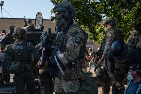 Throughout the video, drones capture footage of the crowd. The FAA ordered a 12 day ban on drones in the area, beginning October 1, meaning the drones are part of DHS’s campaign. At 4:49, a drone buzzes around as agents hang off of a Bearcat, driving by protesters and single family homes (the Bearcat drove down the block, before turning around and returning to the facility).