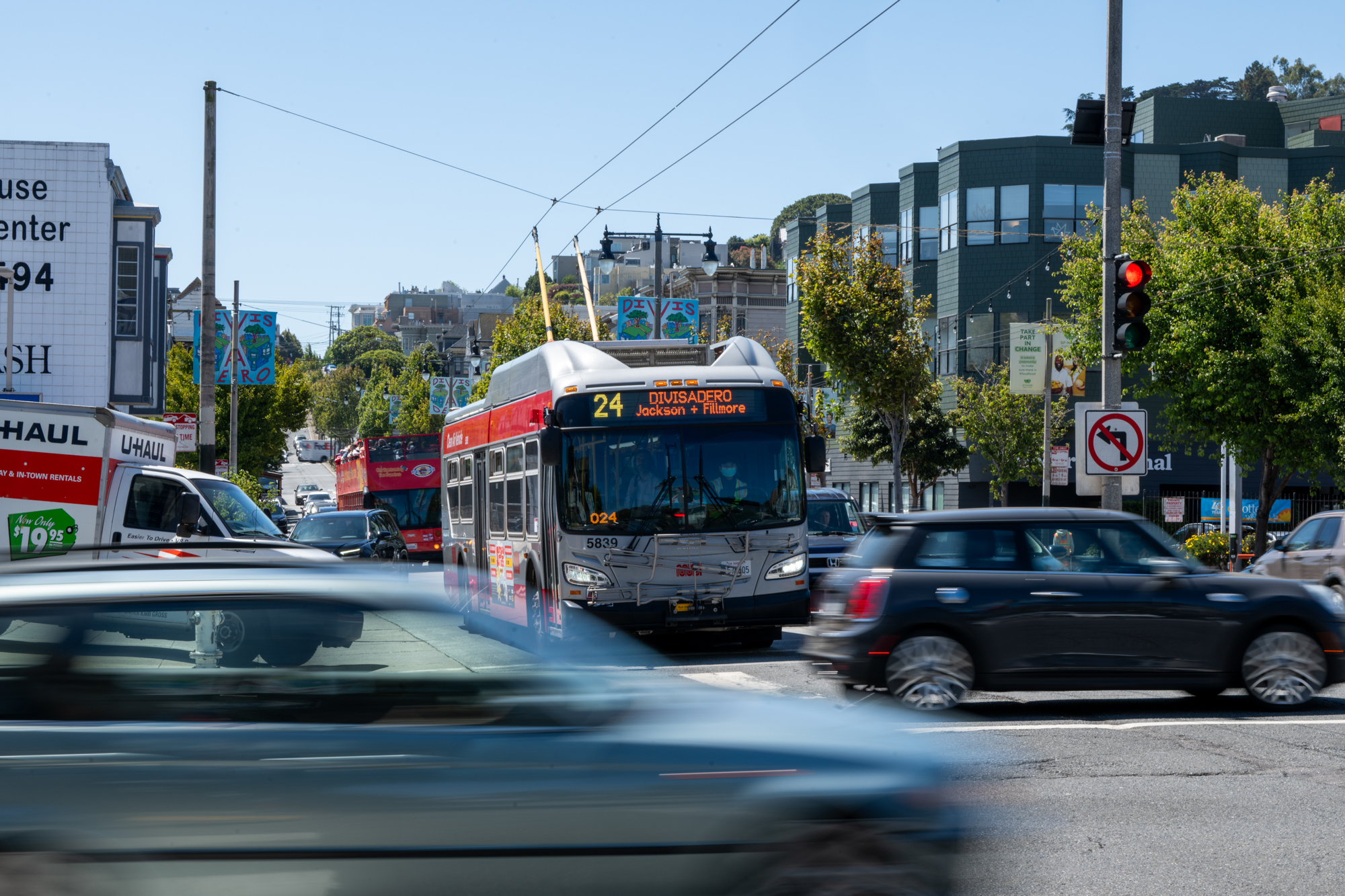 A Muni bus waits at the intersection of Fell and Divisadero streets in San Francisco’s Panhandle neighborhood on Aug. 8, 2025. (Beth LaBerge/KQED)When SFPD initially responded to the scene, it reported that the vehicle involved was a Lime e-scooter, but later said it remained unclear what kind of scooter it was. Lime also confirmed that the rider was not on one of the company’s electric scooters.