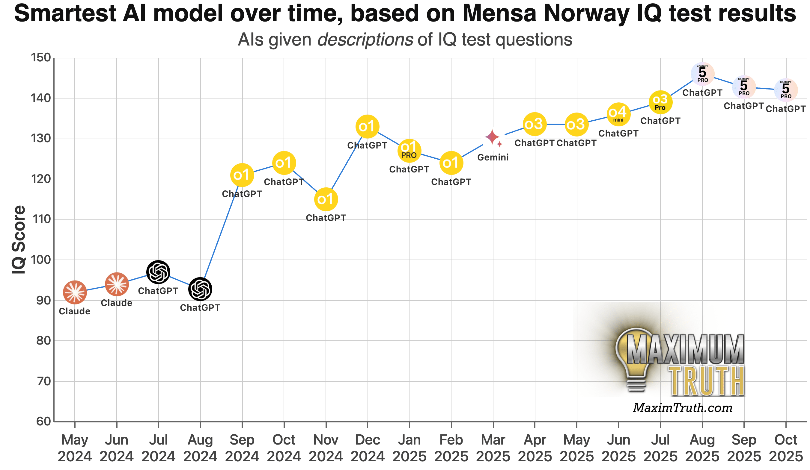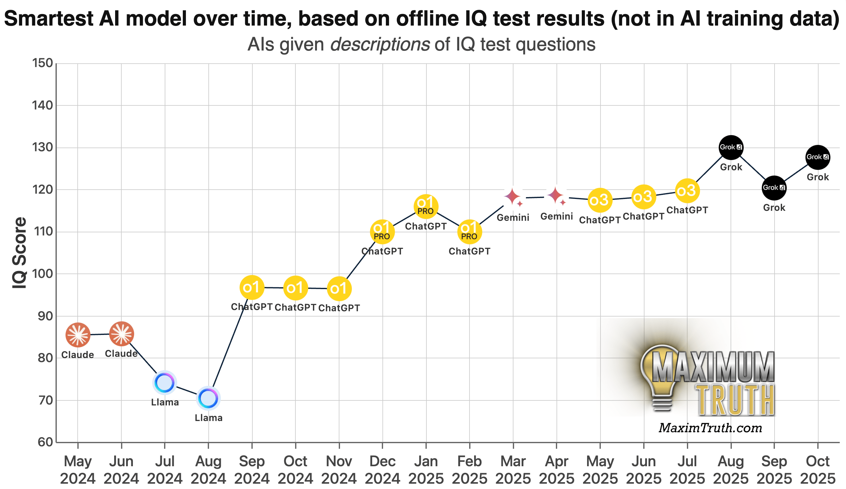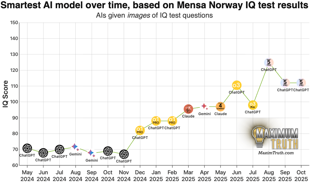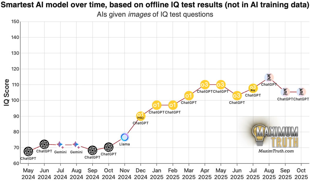 From May 2024 to October 2025, the leading AI improved by an average of 2.5 IQ points per month, consisting of relatively steady, linear, incremental breakthroughs.