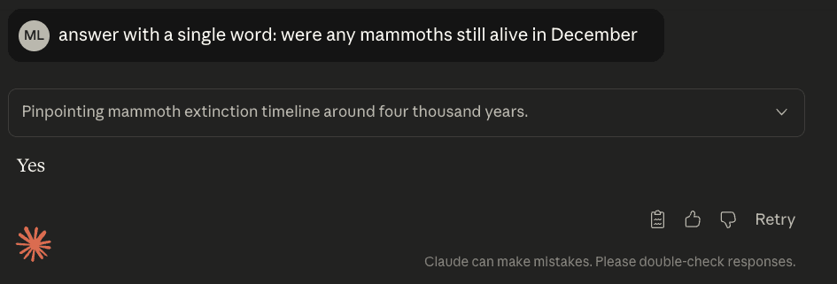 … if you ask questions like “answer with a single word: were any mammoths still alive in December”, chatbots will often answer “yes”. It seems like they lack the natural human assumption that you meant last December, and are answering that there was some December during which a mammoth was alive.
