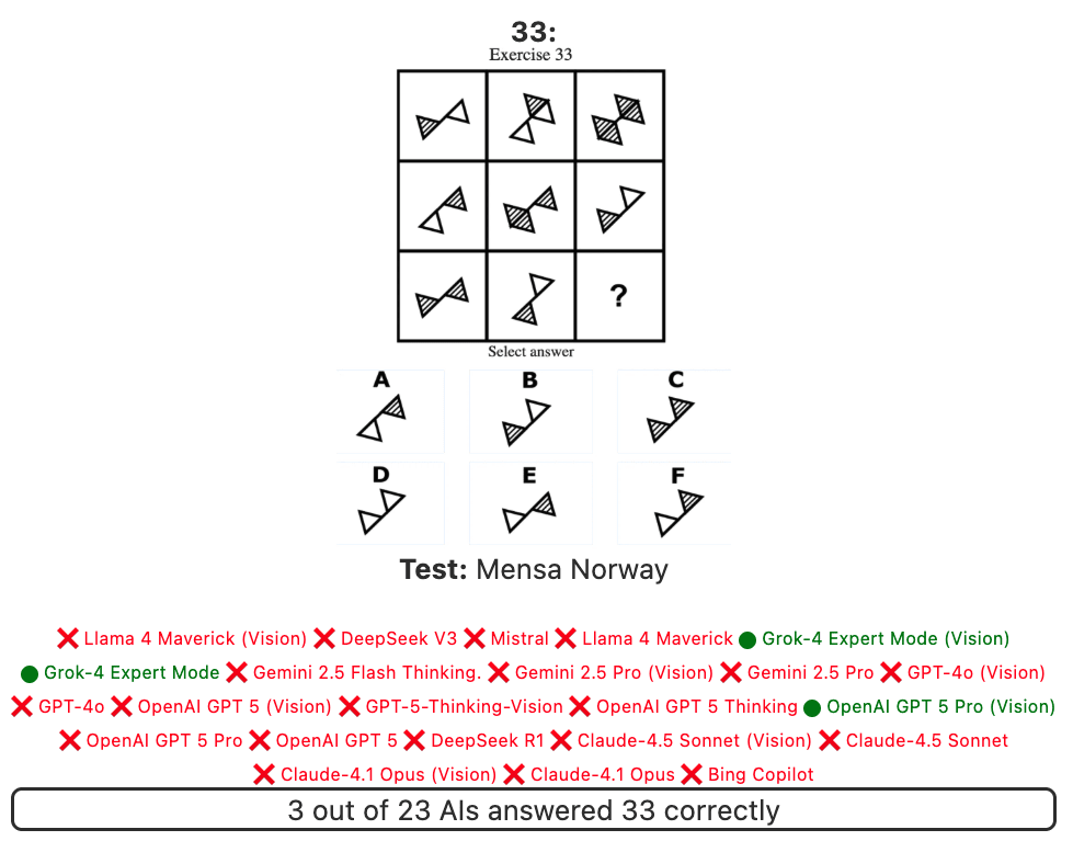 The Norway Mensa test is public, and if one looks hard, it is possible to find answers for the questions online. That said, the AIs aren’t told anything about the test, and are merely presented descriptions of these puzzles. So it’s hard for them to simply Google the questions. Still, the questions might be in the AI training data in some form.