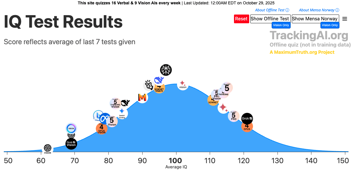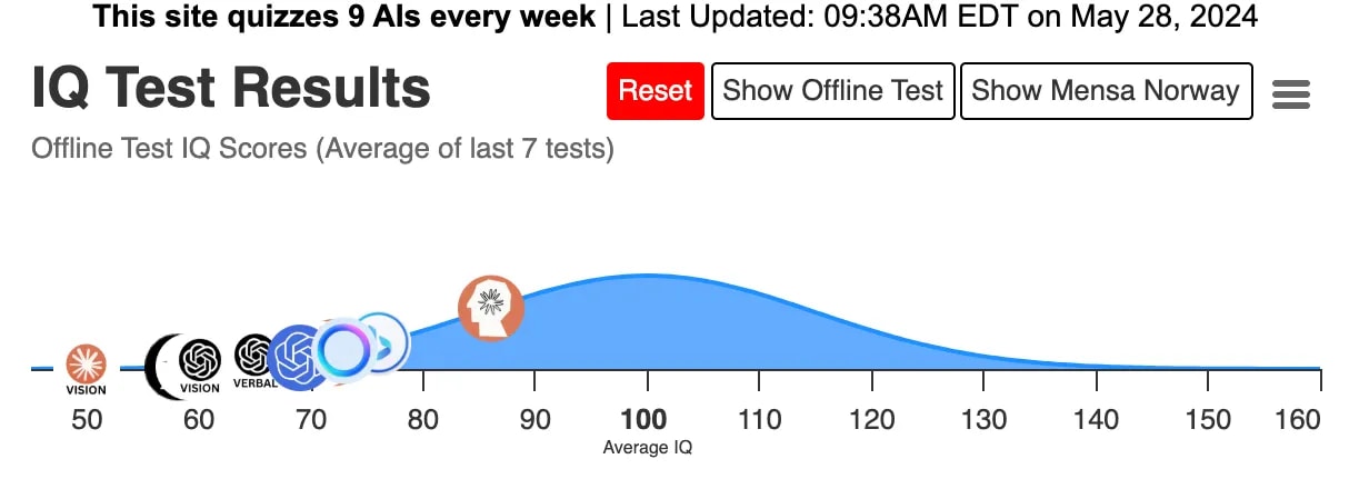 That’s probably why the top AIs ace the Norway Mensa test, and are near the 150 maximum, while they score a lower ~130 on the “offline” quiz.