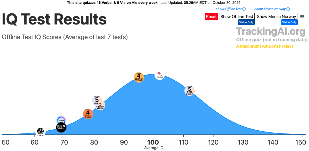 On the offline vision test specifically, there is indeed a plateau since April 2025. But if we smooth it out and treat it linearly, it’s been gaining an average of 2 IQ points per month since May 2024.