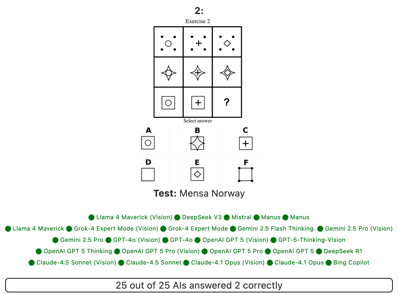 I can’t show the questions for the “offline” test, since that’d give them away to future AIs, but I can show some of the Norway Mensa problems to give you a sense of them. Here’s the easiest question, which every AI gets right:
