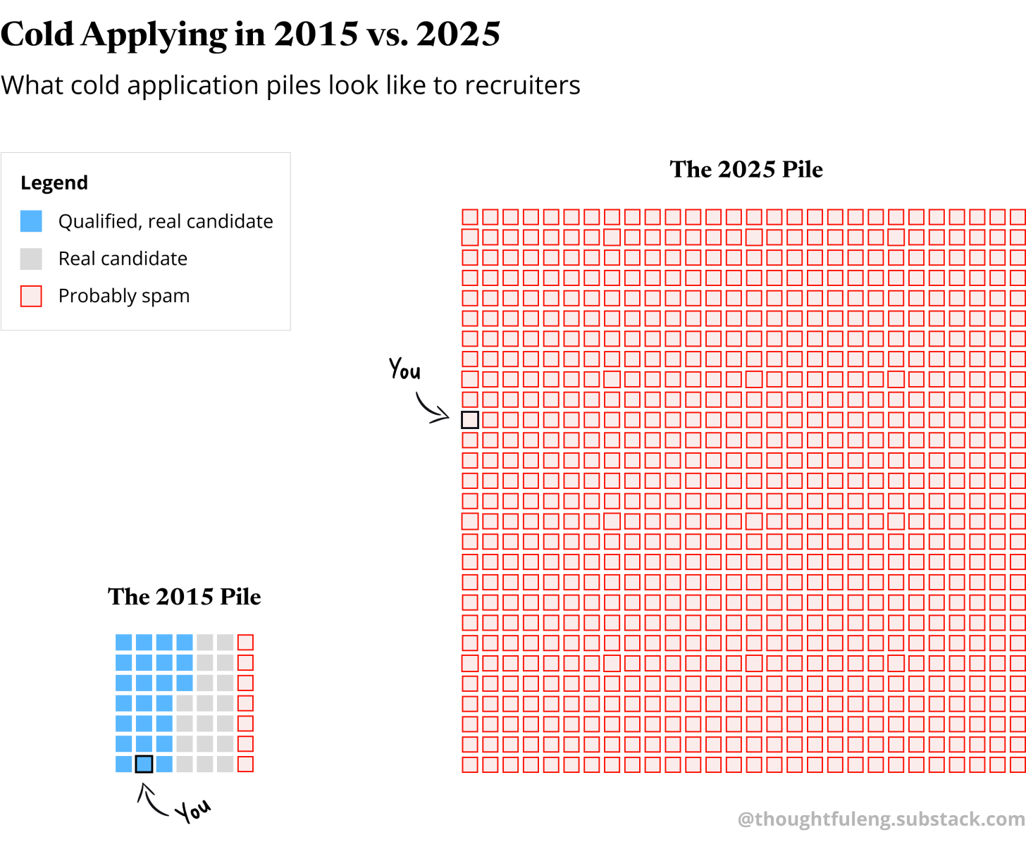 The problem isn't them, the job market, or AI. It's their outdated playbook. A decade ago, engineers could wait for opportunities to come to them. Cold applications were taken as a sign of serious intent.