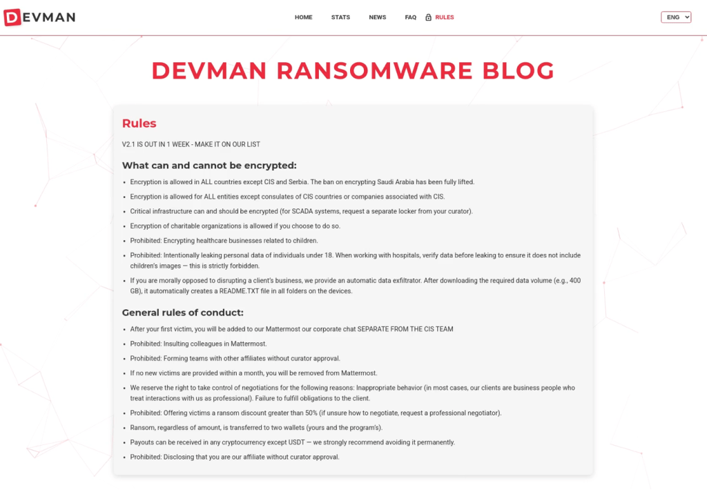 The children-related restrictions are absolute, and the hospital-data verification requirement reflects awareness of how quickly law-enforcement attention escalates when minors are involved. Taken together, the permitted targeting prioritizes leverage in enterprise and public-utility environments, while the restricted targeting establishes a hard red line around minors. However, RaaS operations often publish similar statements that go unenforced when profits are at stake. Hopefully, Devman enforces this because ransomware attacks are awful, but targeting children is deplorable.