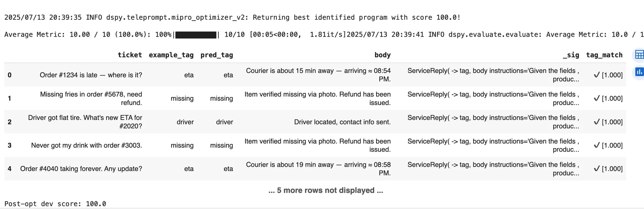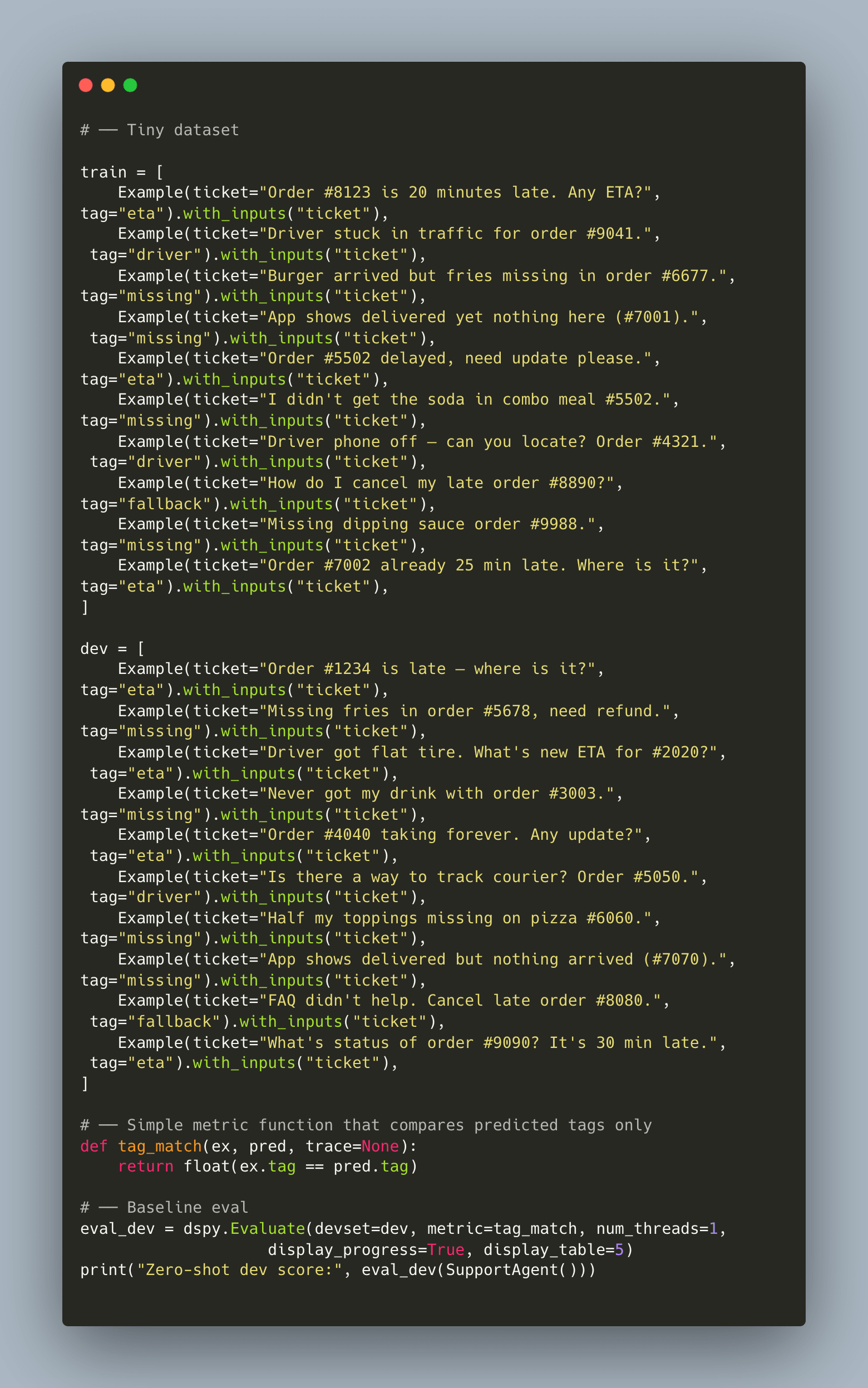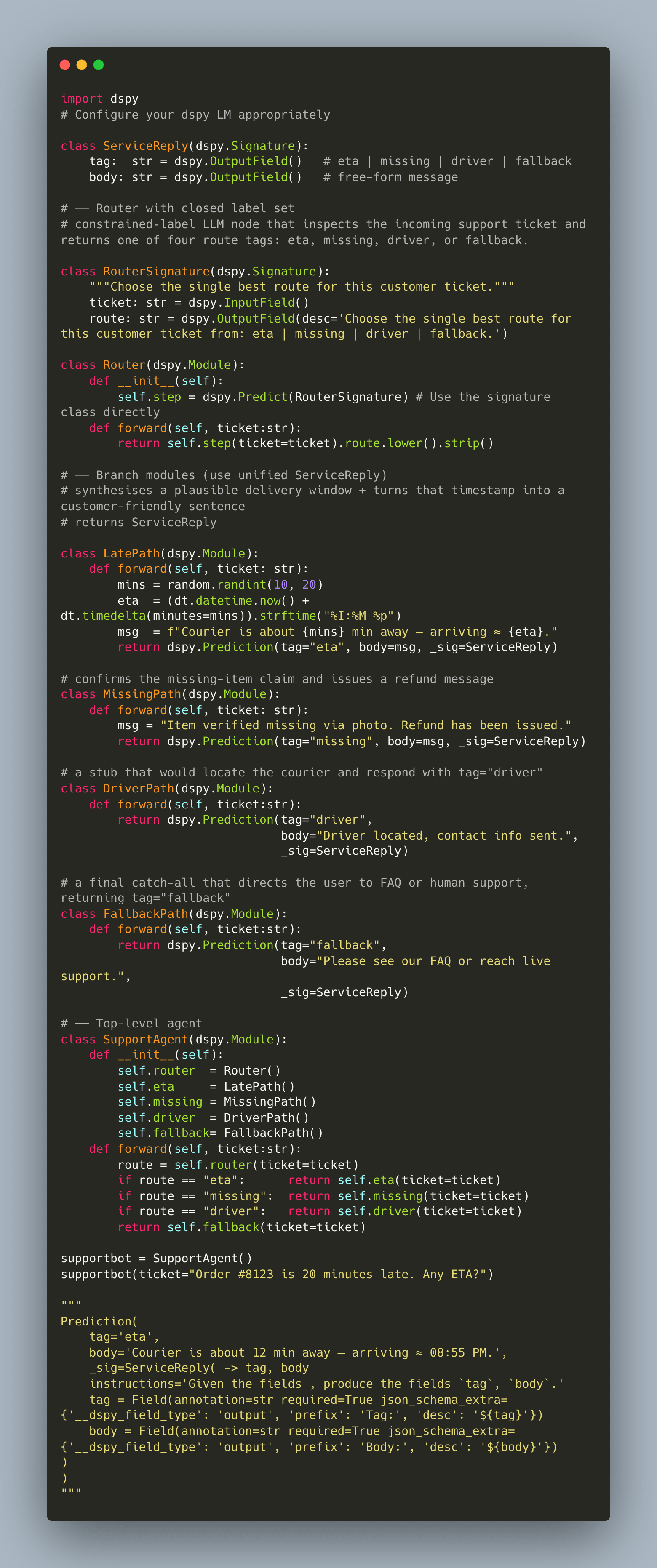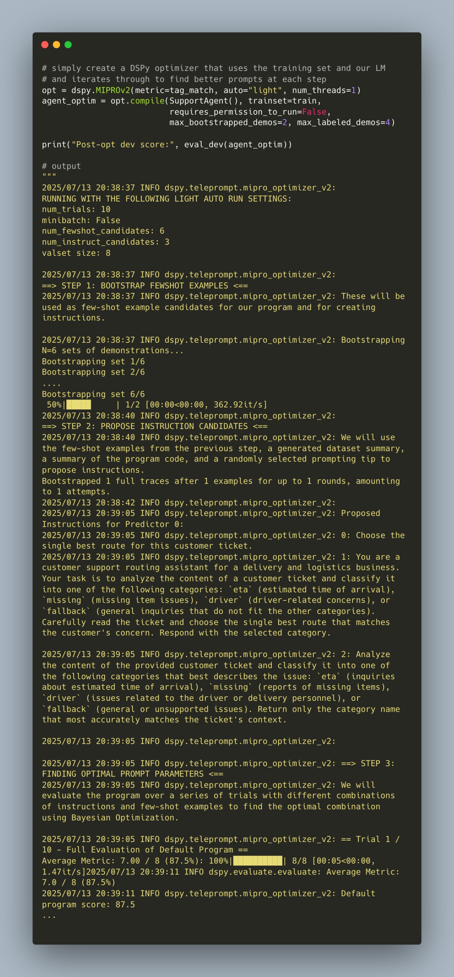 With DSPy, we don’t have to optimize each part in isolation. Instead, we treat the entire workflow — routing, branching, messaging — as something the system can learn. The optimizer becomes a feedback loop embedded in the program itself. You give it data, and it returns a better version of your agent. One that behaves the same on the surface: but under the hood, routes smarter, reasons cleaner, and adapts to the task at hand.