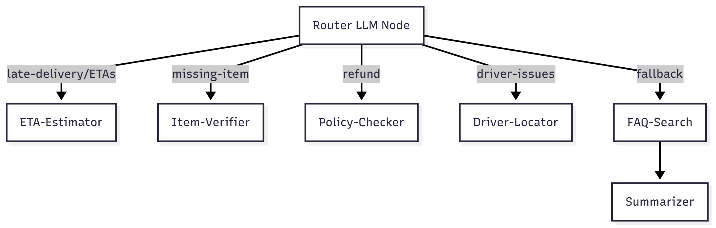 The user writes in: “My order is late”, “I didn’t get my drink”, “Where’s my driver?” — and the agent routes that input through the appropriate branch. If the issue is lateness, it fetches the ETA. If it’s a missing item, it verifies the claim. If it’s both, it might escalate to policy. If nothing matches, it falls back to search.