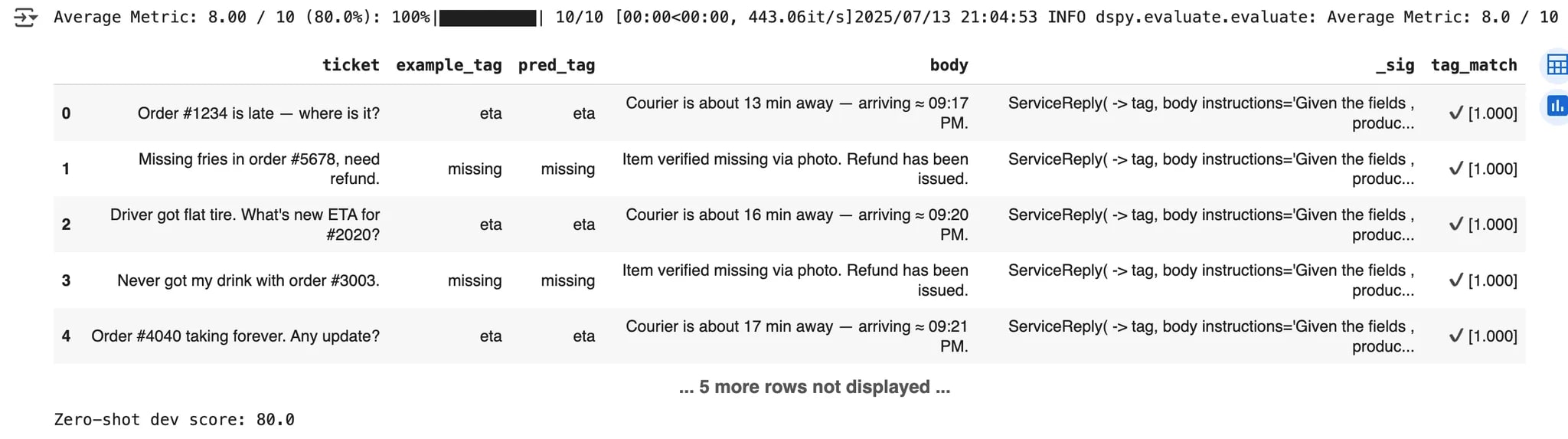 Our initial eval lands at 80% accuracy on the dev set. Not bad for a first pass, though in a production setting, especially at the scale of a ride-sharing company handling millions of tickets with noisy, incomplete data, that number will likely not be the starting point ;)