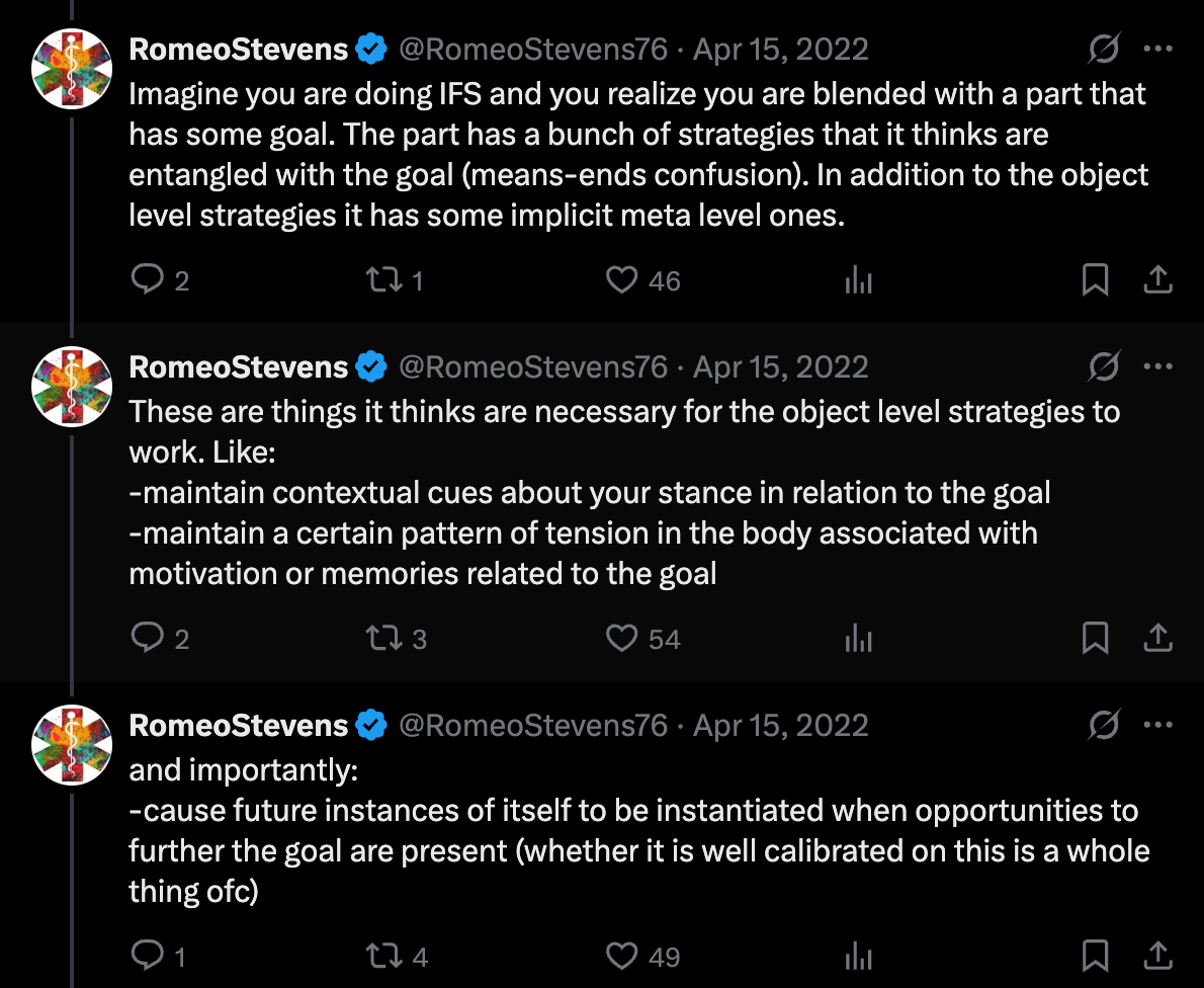 Romeo Stevens has the following take on IFS: sometimes parts are instantiated with the meta-goal of causing future instances of themselves to be instantiated (yes, it’s a loop). I’ve found that it sometimes makes sense to ask a part, “What would it take for you to despawn?” Some parts realize they’re ghosts chasing an incoherent goal and willingly despawn themselves. Others resist despawning — for reasons that might be wise, misguided, or somewhere in between.