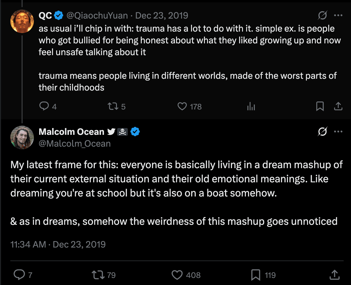 Different parts “grow” at different times in different environments. And the result of this is that we are living in dream mashups of our current situations and old emotional meanings.