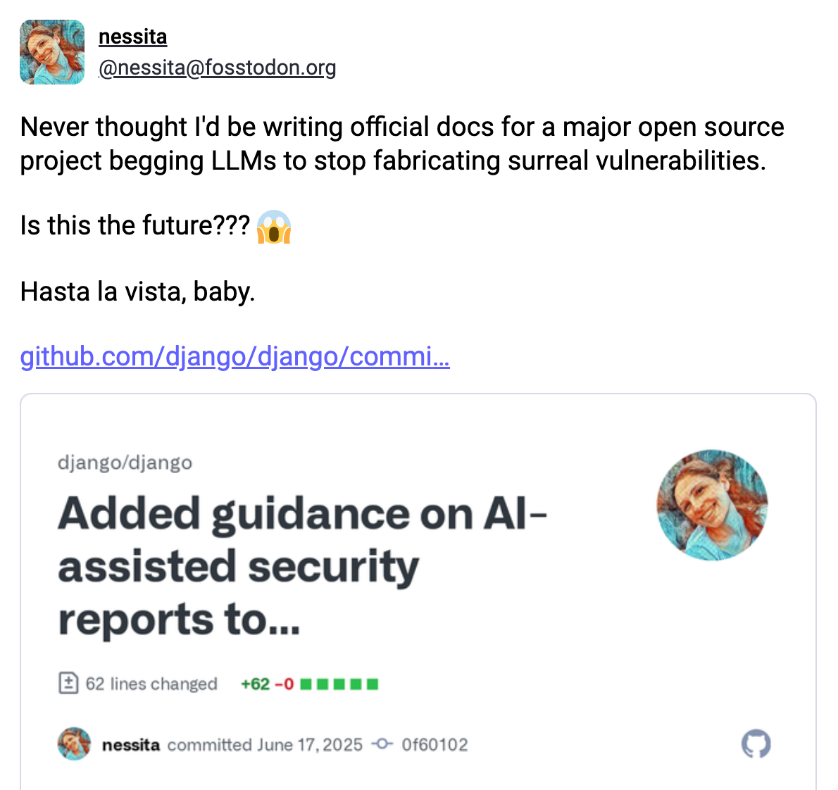 "Never thought I'd be writing official docs for a major open source project begging LLMs to stop fabricating surreal vulnerabilities," Bidart commented on Mastodon.