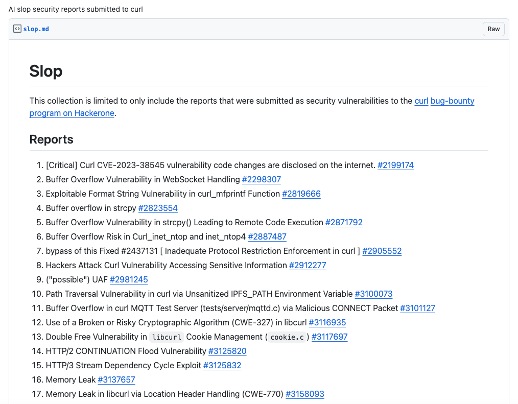 “Fake and otherwise made up security problems effectively prevent us from doing real project work and make us waste time and resources. We ban users immediately who submit made up fake reports to the project.”Curl’s maintainers have been among the most vocal about the impact of AI-generated slop reports. Lead maintainer Daniel Stenberg recently published a public list of 17 AI-generated security submissions the project received through HackerOne. The reports include fabricated functions, imaginary patches, and misuse of vulnerability templates to suggest issues that don’t exist in the codebase.