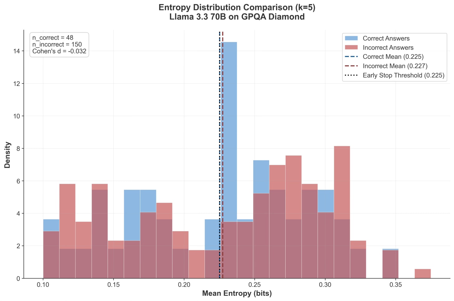 The results were telling. The entropy distributions of correct and incorrect responses almost perfectly overlap. There’s no discernible gap, no sign of emergent confidence. The model’s internal uncertainty doesn’t change whether it’s right or wrong.