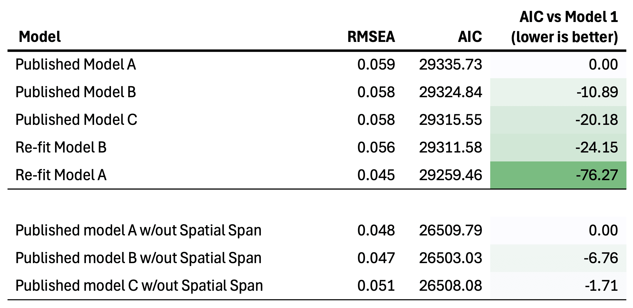 First, let’s replicate the findings using models defined by RBD. This is an important sanity check to make sure we interpreted the data correctly, loaded everything in the right order, and understood the published results. As shown in the figure below (and in code), by fitting the models described by RBD we do in fact get nearly identical path loadings, AIC differences, and chi-square differences (the absolute AIC values were substantially different presumably because RBD used individual-level data). For Model A, the loadings on g are also nearly identical to the published values. As is the headline result: Model C has the best fit. Hurray for reproducibility!