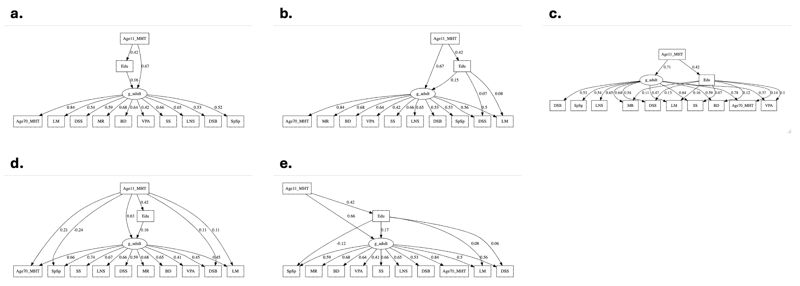 Whew! That’s a lot of fitting only to then compare the models in the same sample for the final evaluation. There’s also a catch-22 that applies more broadly to iterative SEM analyses like these: many putative factor structures are explored and one is selected, then paths for education and the Age 11 MHT are added, should the putative factor structures now all be re-evaluated and re-validated as best fitting? Then more paths are added and removed; should the factor structure again be re-validated? The implicit assumption here is that step-wise improvements to model fit will only get you to a superior model, but it is well known that such an algorithm will often converge to only a local optimum or simply overfit to noise in the sample. We shouldn’t fault RBD too much, validation in an independent dataset (or even cross-validation) just don’t seem to be common practices in this field. But it does put a damper on drawing any broadly generalizable conclusions from this analysis.