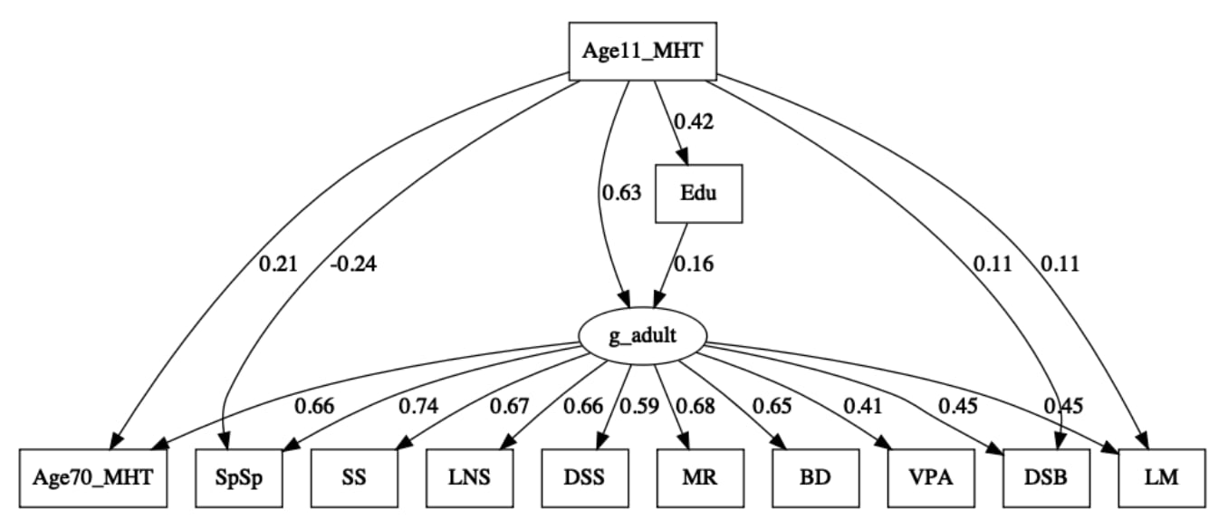 One of these residual covariances (between the Age 70 MHT IQ test and the Spatial Span test) was “unexpectedly” negative, meaning that individuals who do well on the MHT tend to do poorly on the Spatial Span test (when considered jointly with the other structural constraints). The consequences and interpretation of this negative path are unclear but it was retained because it improved model fit.