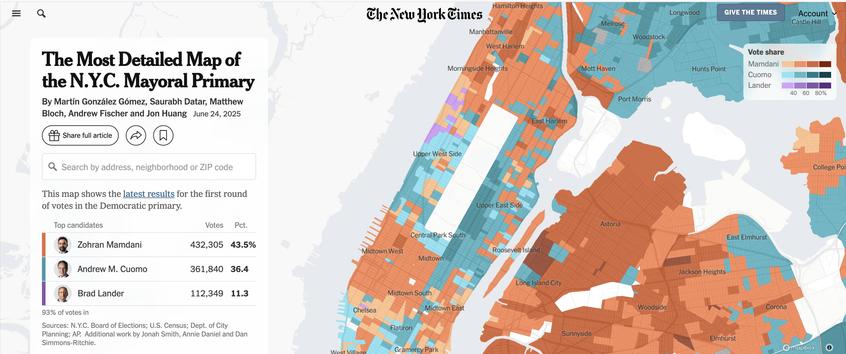 Clearly, these proposed tax changes got the attention of New York City’s richest residents. Preliminary granular election data from the New York Times, pictured below, shows that Cuomo (teal) handily defeated Mamdani (orange) among a specific demographic: the rich people who live around Central Park.