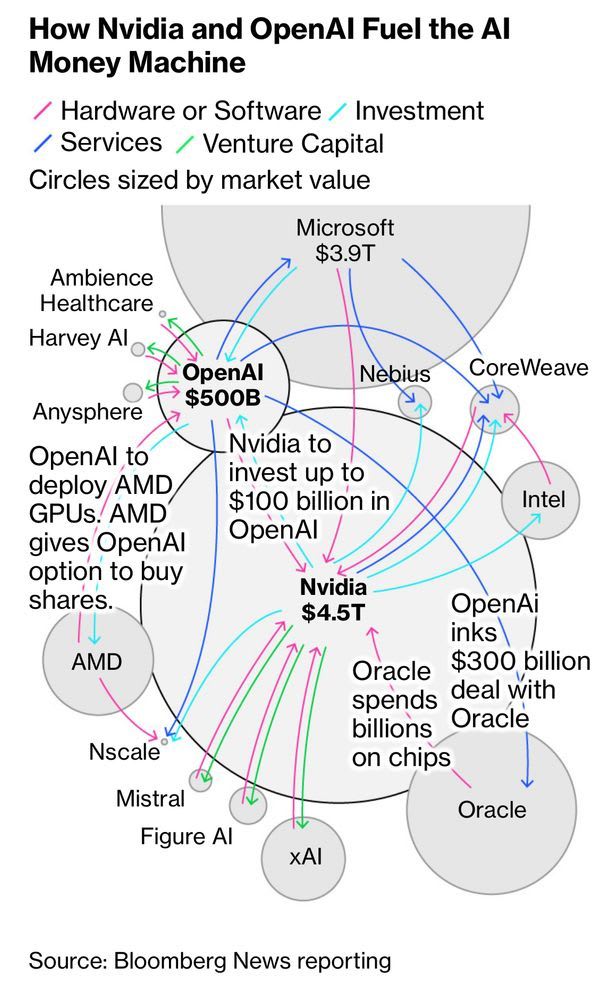 It’s all so ludicrous. And, tragically, it’s driven poor Ed Zitron insane. But more cracks are starting to appear even among the AI devout. To wit: Last week Ben Thompson in Stratechery, he who gushes about AI regularly, wrote “we’ve obviously crossed the line into bubble territory, which always was inevitable.” Oh, ok then! Meanwhile Matt Levine, who keeps an admirable even keel, observes that OpenAI is announcing deal after deal that’s premised on the announcement of the deal itself being the very thing that finances the deal, leading to this masterful paragraph: