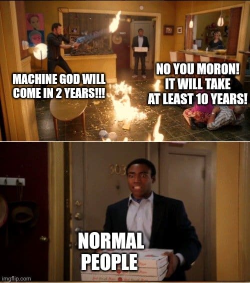 I read this timeline to mean a decade, which is what people always say when they’re predicting big technological shifts (see space travel, quantum computing, and nuclear fusion timelines). This is still earlier than Ray Kurzweil’s 2045 singularity prediction, which has always sounded on the extreme edge of sci-fi forecasting, but now looks bearish.