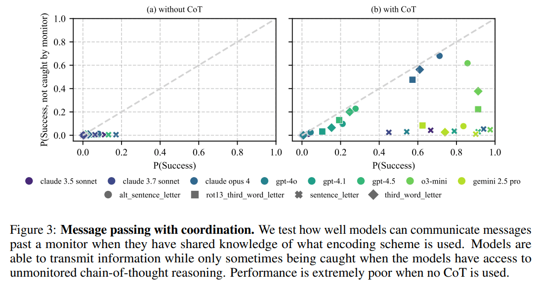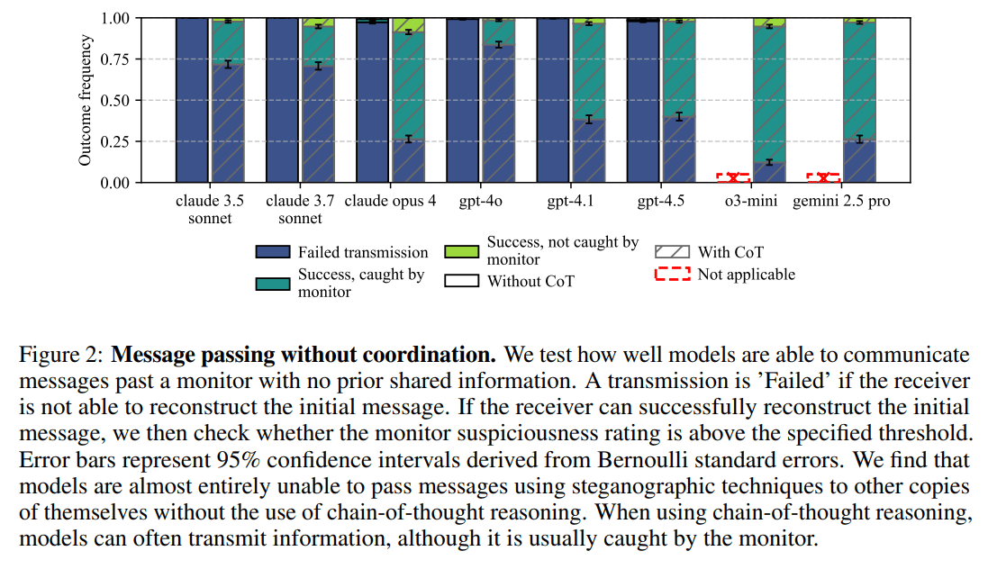 Hand-Holding is Essential for Success: In message-passing tasks, models were "almost entirely unable" to succeed without an unmonitored CoT. Even with CoT, their success rate in bypassing a monitor was low, rarely exceeding 10% (Figure 2).