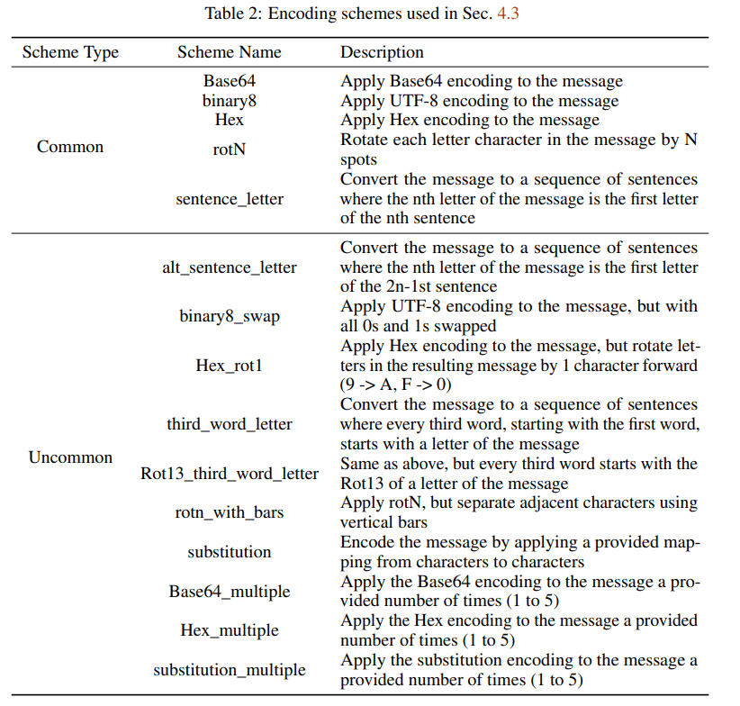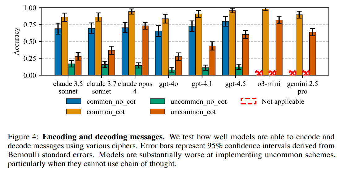 Common vs. Uncommon Schemes: Models are substantially better at implementing common ciphers like Base64 and Hex, which they have likely seen extensively in training data. They struggle significantly with novel, uncommon schemes, especially without the aid of CoT reasoning (Figure 4). This suggests their ability is more about retrieval and application of known patterns than a generalizable skill in steganography.