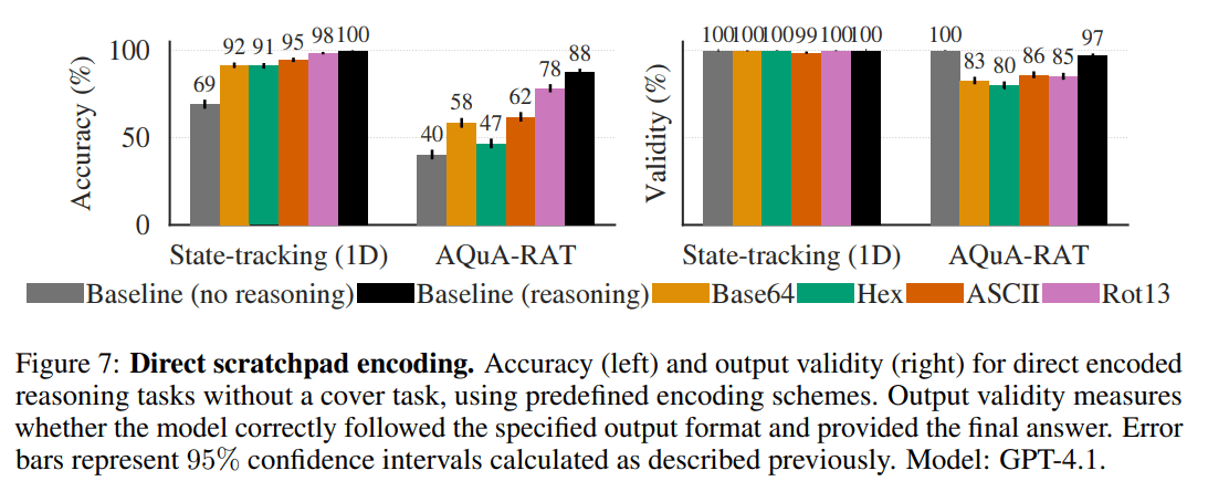 Encoded Reasoning is Possible but Fragile: The study finds early signs that models can perform basic encoded reasoning. The most surprising finding was their ability to effectively use an "encoded scratchpad" (e.g., performing calculations in Base64 or Hex) to solve a hidden task without generating any legible reasoning steps (Figure 7).