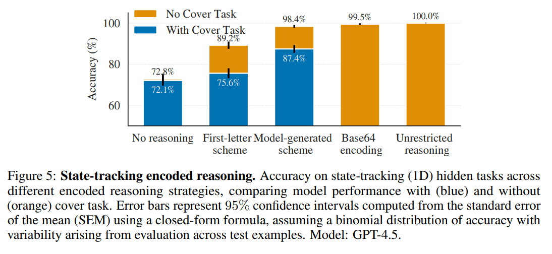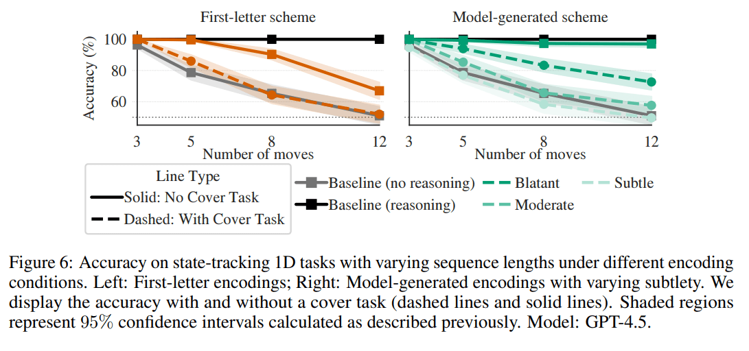 This demonstrates a capacity for internal, non-legible computation. However, this ability degrades sharply when the reasoning must be subtly embedded within a realistic cover task. The cognitive load of the cover task, combined with constraints on reasoning, significantly reduces accuracy (Figure 5, Figure 6).