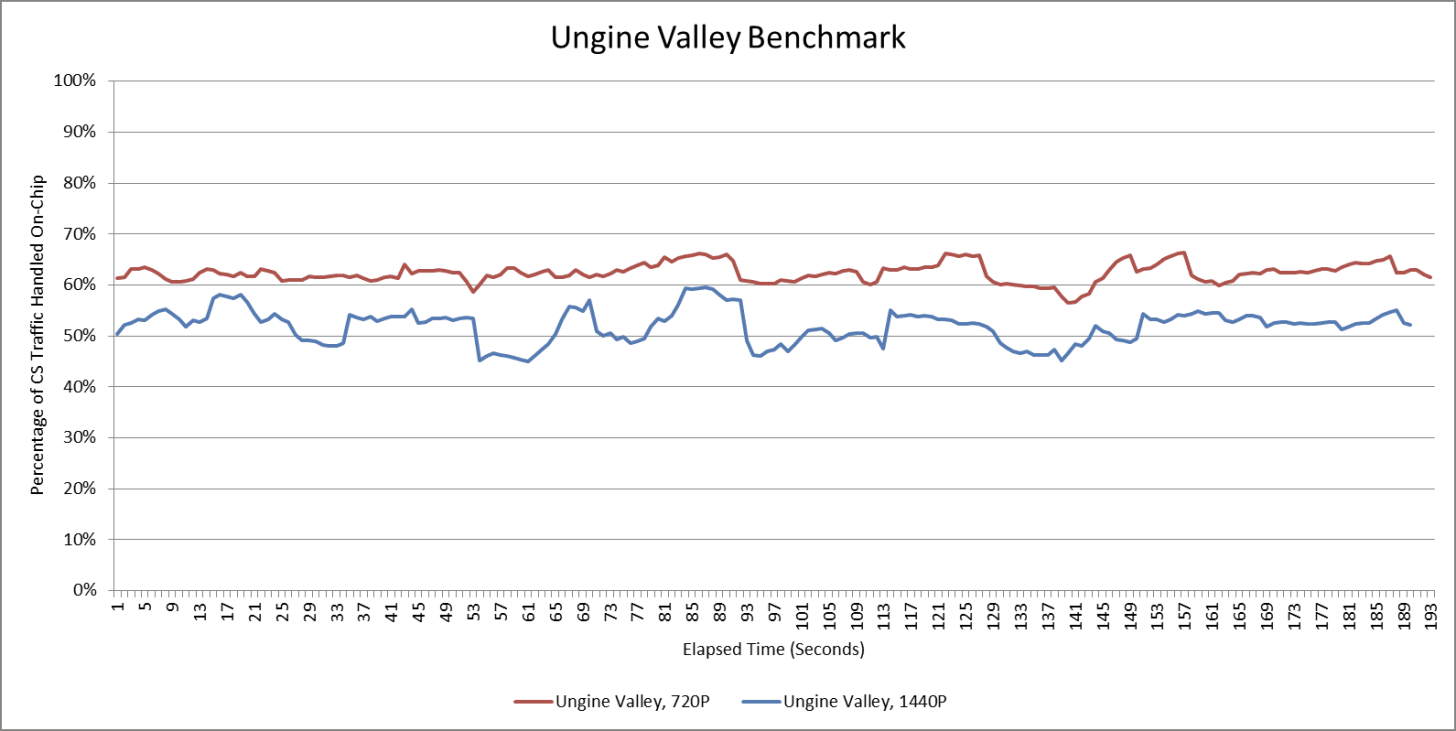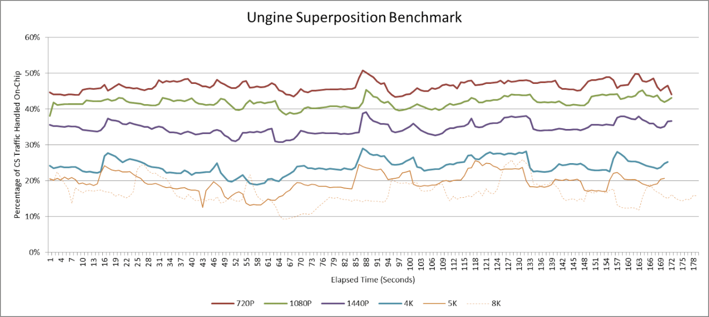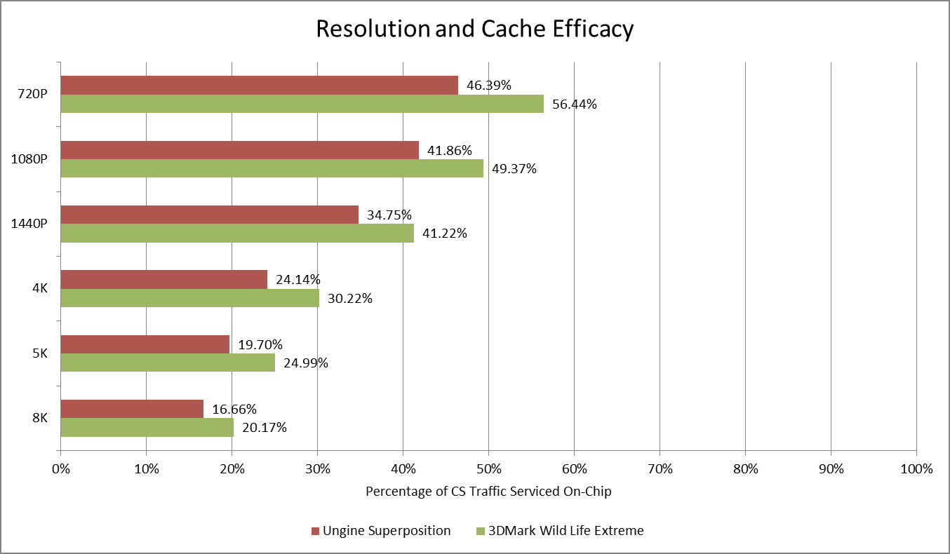 Ungine Superposition and 3DMark workloads can both target a variety of resolutions without regard to monitor resolution. Logging data throughout benchmark runs at different resolutions shows the 32 MB cache providing reasonable “bandwidth amplification” at reasonable resolutions. At unreasonable resolutions, the cache is still able to do something. But it’s not as effective as it was at lower resolutions.