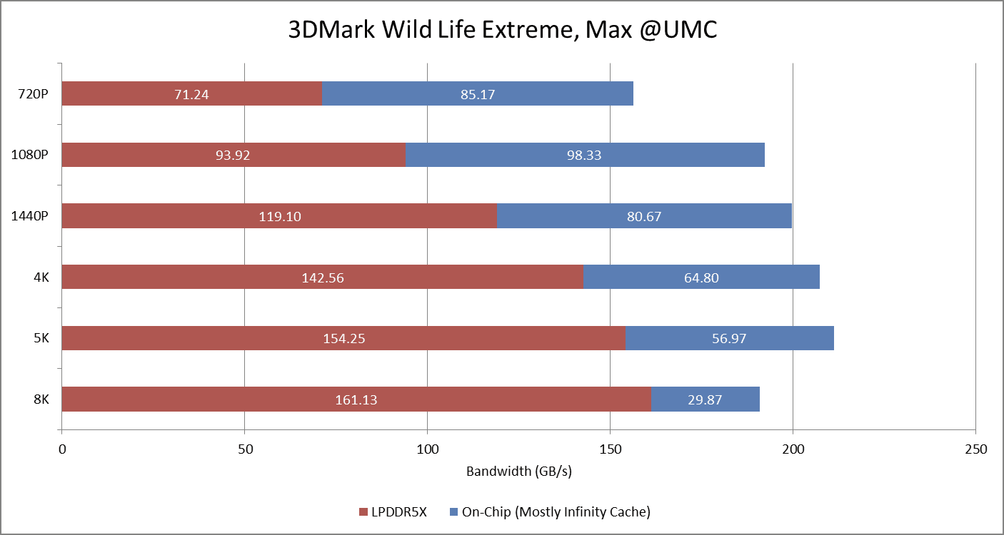 3DMark Wild Life Extreme is a better example because it’s a lightweight benchmark designed to run on mobile devices. Strix Halo’s iGPU can average above 30 FPS even when rendering at 8K. Again, DRAM bandwidth demands increase and Infinity Cache becomes less effective as resolution goes up. But Infinity Cache still does enough to keep the chip well clear of DRAM bandwidth limits. Thus the cache does its job, and the bandwidth situation remains under control across a wide range of resolutions.