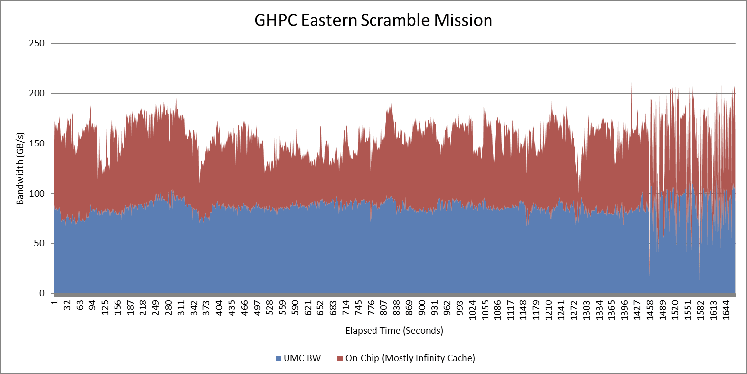 I logged data over some arbitrarily selected graphics workloads, then selected the 1-second interval with the highest DRAM bandwidth usage. That should give an idea of whether Strix Halo comes close to reaching DRAM bandwidth limits. Overall, the 32 MB cache seems to do its job. Strix Halo is able to stay well clear of the 256 GB/s theoretical bandwidth limit that its LPDDR5X-8000 setup can deliver.