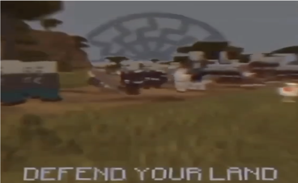 One widely circulated video among far-right extremist Telegram channels, Mincraft avatars are depicted marching under the Black Sun (Sonnenrad), a symbol commonly associated with neo-Nazi groups, with the caption “Defend Your Land” written on it. This screenshot below (see figure 2) was taken from the original 33-second video circulating on a neo-Nazi Telegram channel.