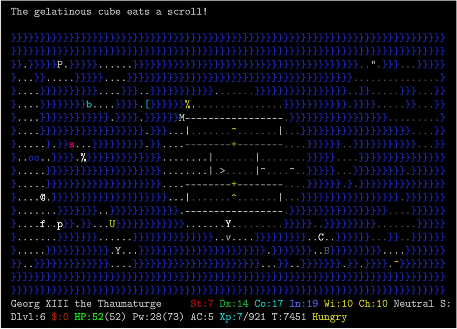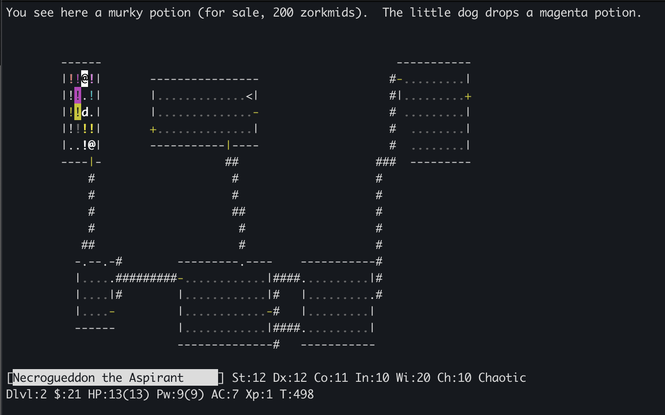 Separately from its use as an RL benchmark, I found NetHack to be a lot of fun once I got used to the ASCII visuals. The upside of having primitive graphics is that the game can be much deeper and more complex, since graphics rendering is no longer a constraint and lots of information is communicated through text—the limiting factor then becomes the imagination of the designers. I’ve alluded to some of the interesting mechanics above, but there are many more: there is a whole system of alchemy where you can mix potions to create others, polymorph spells can be cast on objects (including magical ones) to create others, you can also polymorph yourself into various monsters and inherit their abilities (including laying eggs - which can then hatch and become your minion children), you can write your own scrolls and enchant your weapons and inventory, there is a whole set of unique magical artifacts you can collect, etc. I particularly enjoyed playing the wizard - although they are weak in the early game, if they survive past a certain point and get access to more advanced magic, a whole level of complexity and fun gets unlocked. As part of my deep dive I read James Craddock’s book Dungeon Hacks, which goes into the history of roguelikes and how they grew from a combination of D&D and early Unix culture (apparently Ken Thompson, original creator of Unix and later Turing award winner, was a big fan of NetHack’s precursor Rogue and even spent time hacking the permadeath feature to enable reloading saved games). Being open source, NetHack is actually the work of many contributors who designed different levels, characters and quests, which explains in part its sprawling diversity. It is also sprinkled with nerdy fantasy/literary/Unix references which are fun to discover. All this to say, if you’re working with the NLE and want to build some intuitions about the game (which is very helpful for diagnostics), the game can actually be quite fun given some time.