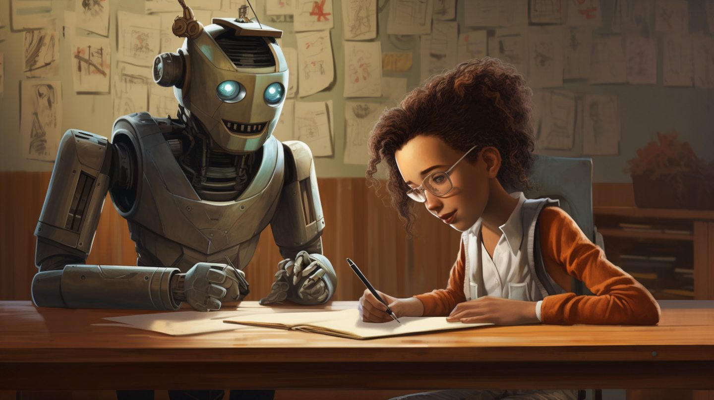 An AI-generated image of a student getting help from a robot. Credit: Midjourney