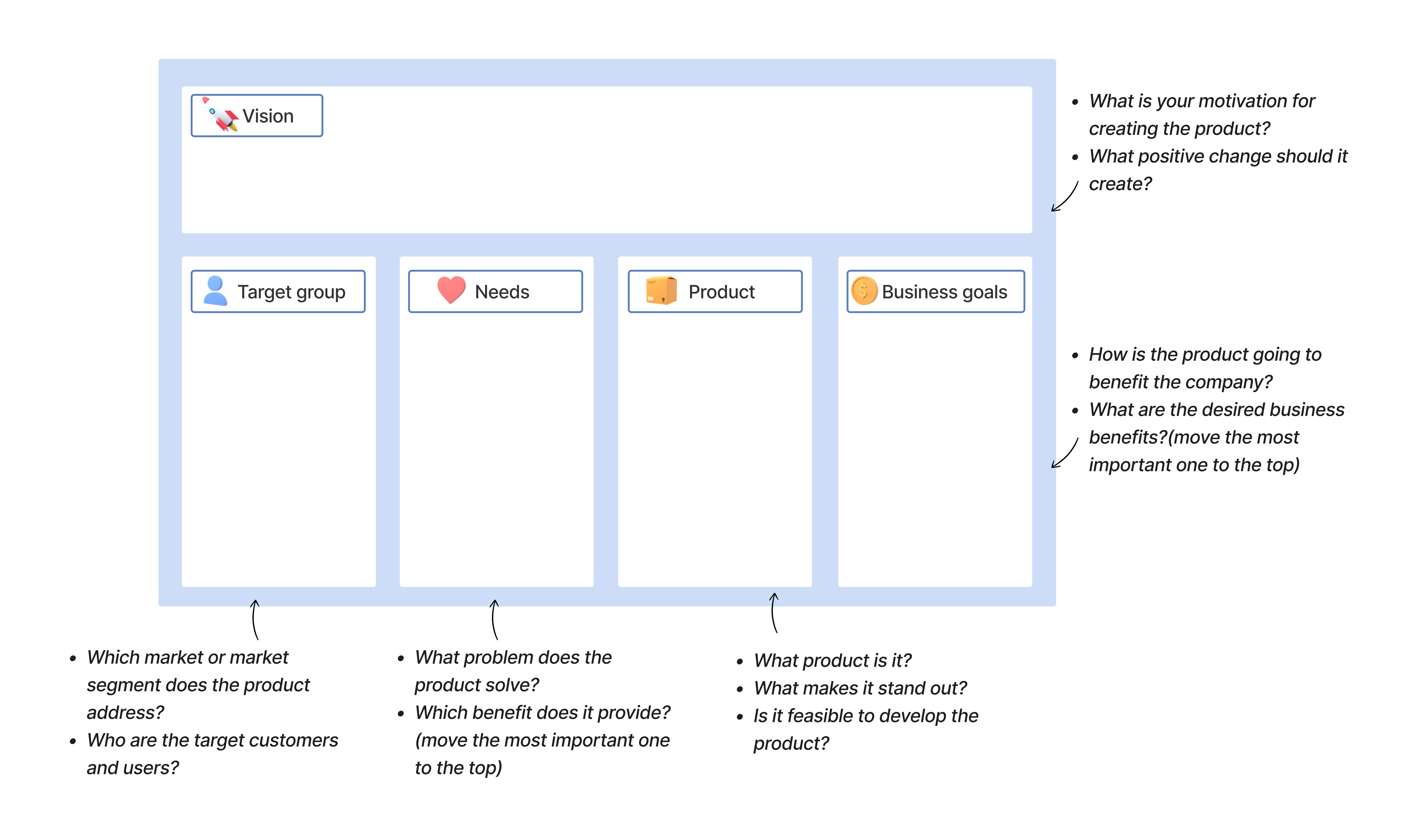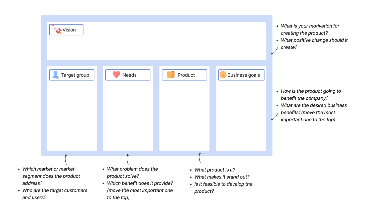 That’s where the Product Vision Board shines. It lays out five foundations: