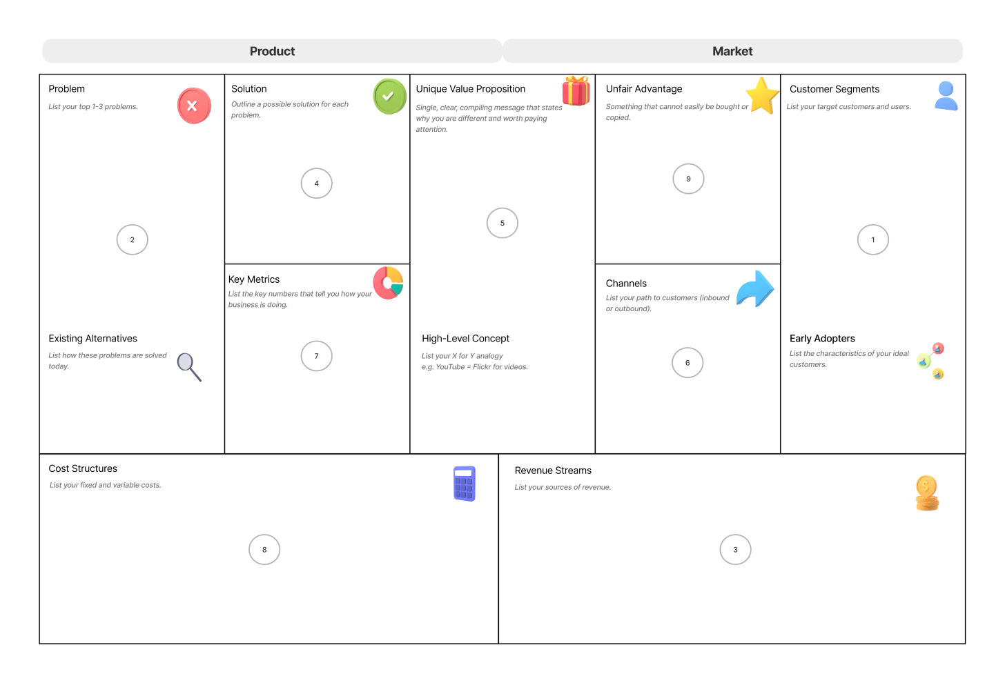 Problem, Customer Segments, Unique Value Proposition, Solution, Channels, Revenue Streams, Cost Structure, Key Metrics, and Unfair Advantage.