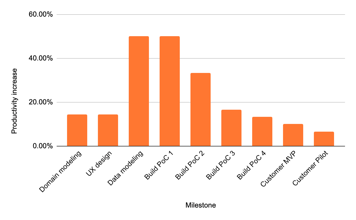 At Rekall we build and scale software products, so a lot of our development work is building MVPs from scratch. We regularly invest in sharpening our technology stack to increase our effectiveness. Recently we did an informal estimation of the productivity impact of AI coding assist across different areas of greenfield software development: